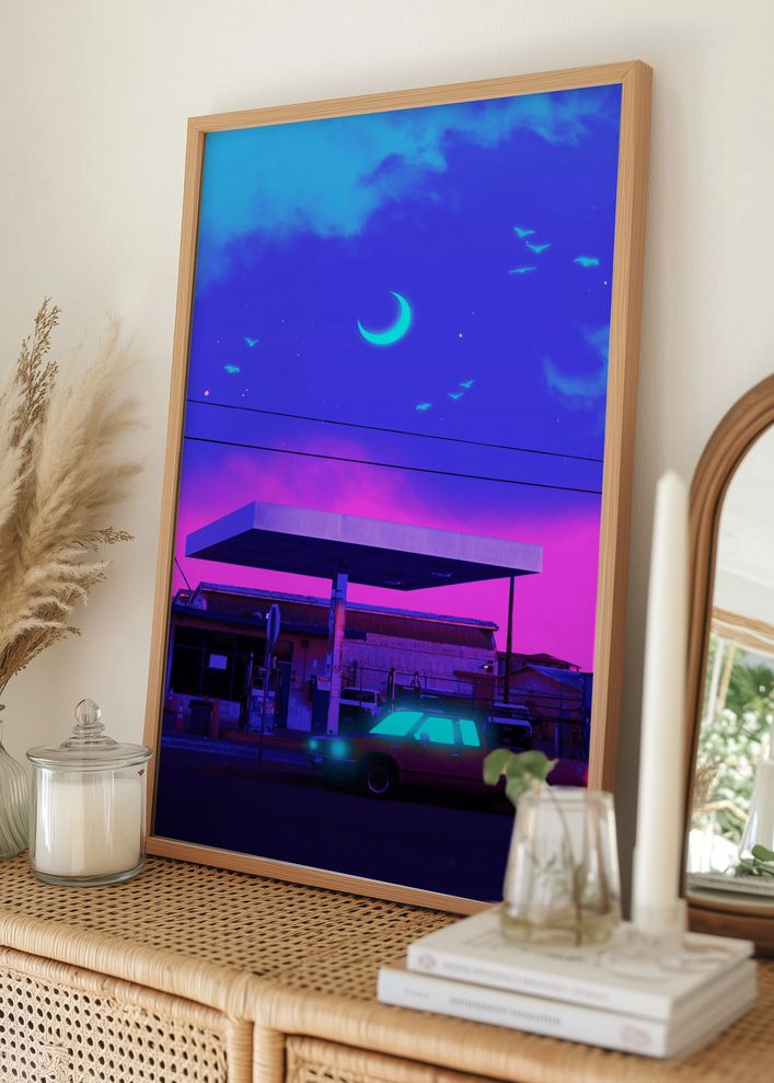 Denna poster fångar en stämningsfull nattvy över en retro bensinstation under en magiskt stjärnklar himmel. Med en måne som hänger lågt på himlen, skapar motivet en drömlik känsla som kan vara både nostalgisk och futuristisk. Gasstationen och den parkerade bilen bidrar till scenens urbana och tidlösa atmosfär. Perfekt för de som älskar både det moderna och det klassiska.