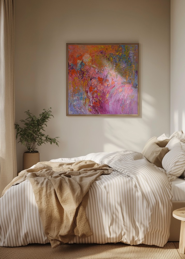 Denna livfulla affisch är ett konstverk som fångar uppmärksamheten med sina dynamiska färger och energiska penseldrag. Motivet sprudlar av intensiva nyanser av orange, rosa, och lila, med inslag av grön och blått som skapar en harmonisk balans och djup i bilden. Den expressiva känslan hos denna poster gör det till ett perfekt val för att liva upp vilket rum som helst.