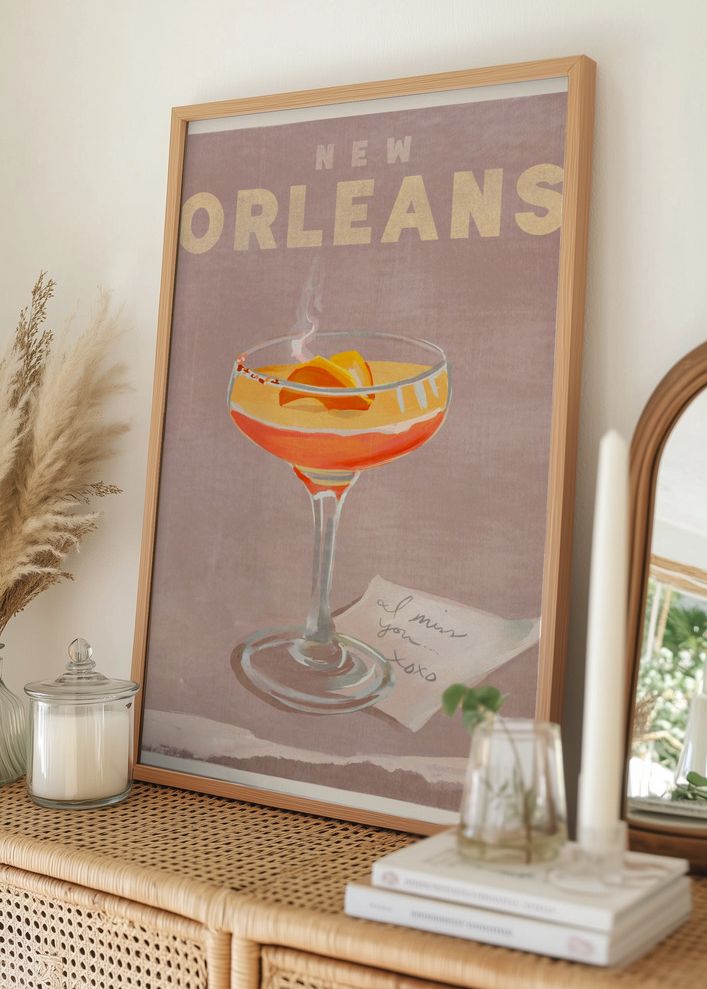 Upptäck charmen i vår stilfulla poster som fångar essensen av New Orleans med en elegant drink som mittpunkt. Denna affisch är perfekt för den som älskar vintage-estetik och vill tillföra en touch av sofistikation till sitt hem eller kontor. Den framträdande drink-motivet, med sin subtila rökighet och dekorativa apelsintwist, är perfekt avbildad för att framhäva en känsla av lyx och avkoppling.