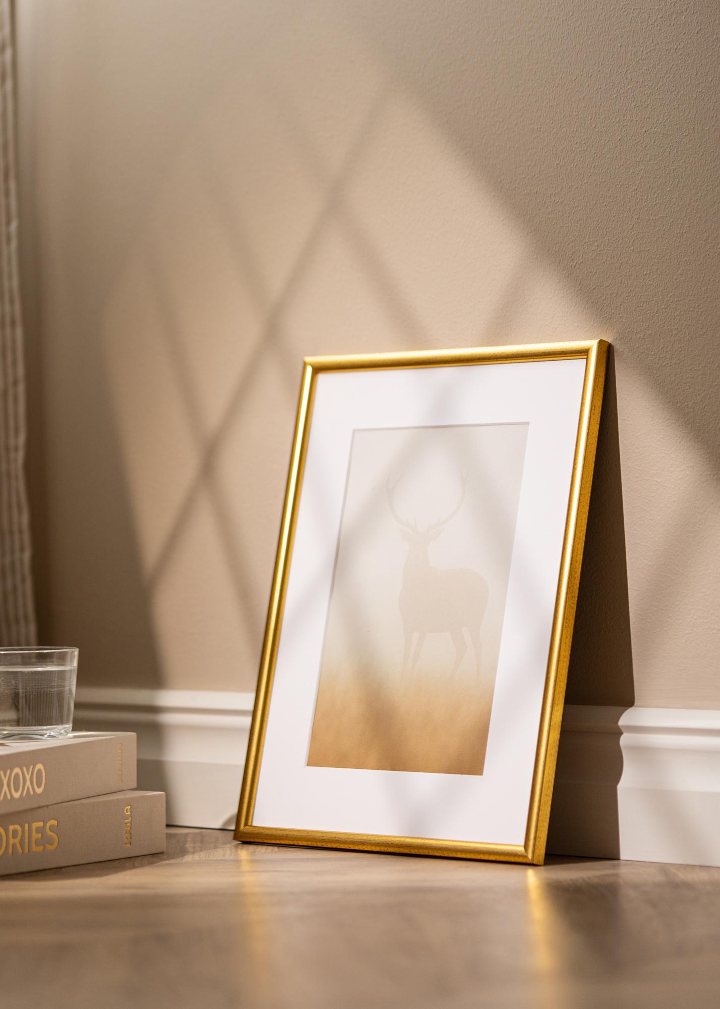 Newline Guld har en tunn ramprofil (15 mm) som ger fokus på motivet i ramen. Ramen har en rödspräcklig guldprofil som ger en gammeldags framtoning.