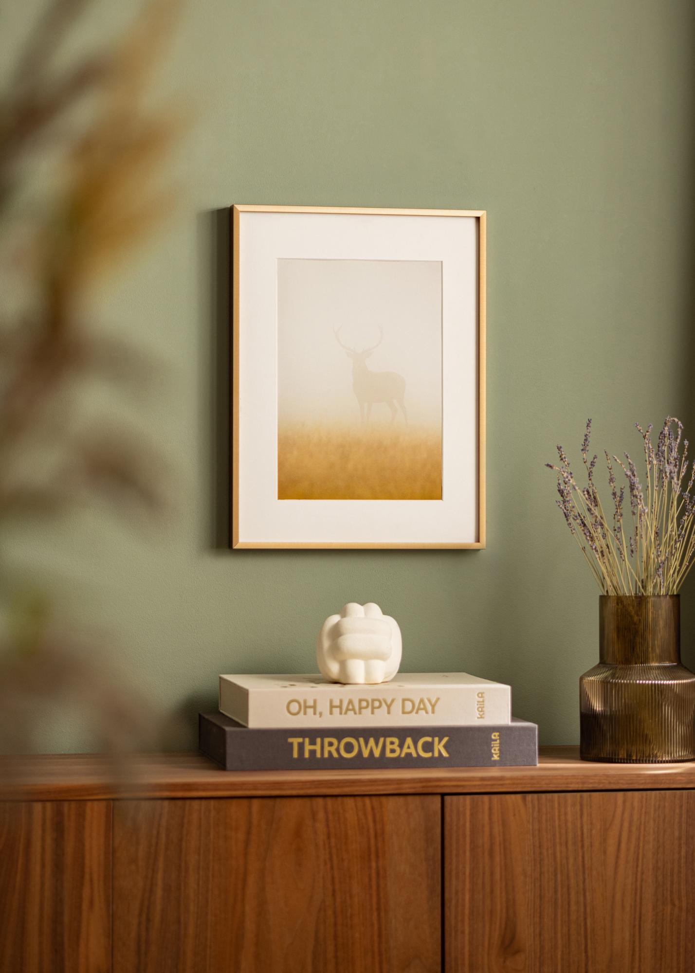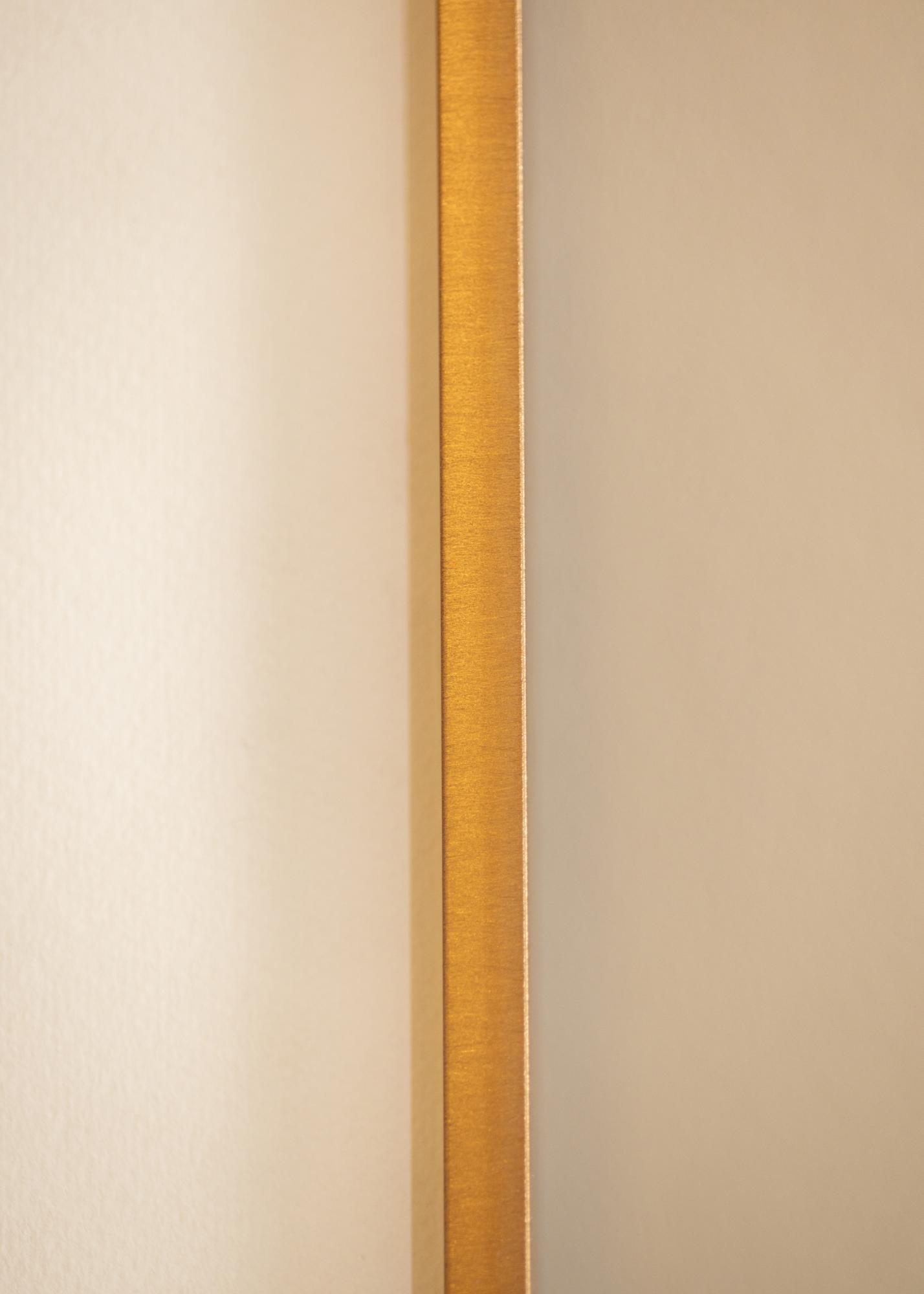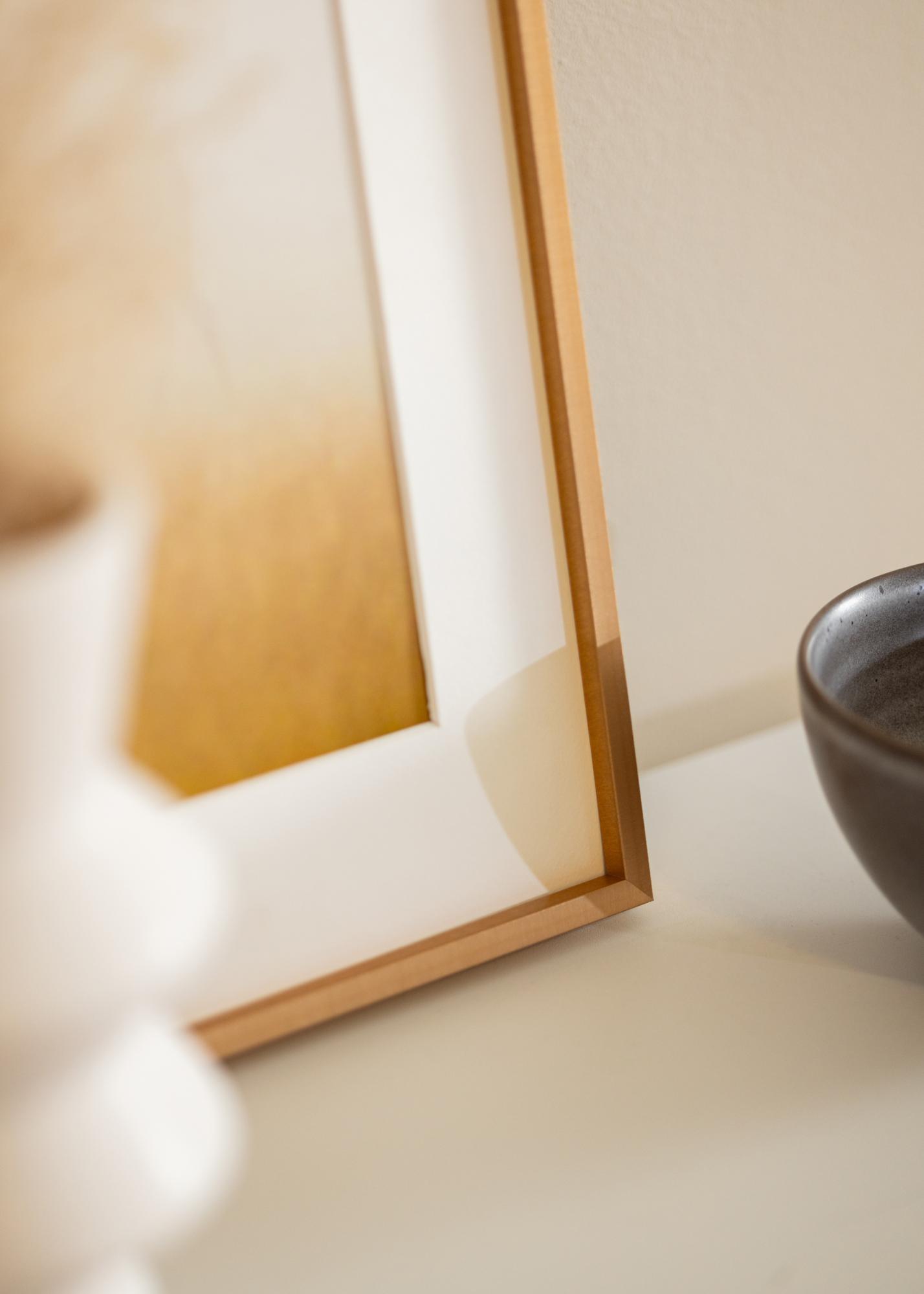 Den borstade ytan på ramen ger en mjuk lyster och subtila färgskiftningar, vilket bidrar till ett levande och dynamiskt utseende. De skarpa kanterna och den minimalistiska designen förstärker det moderna uttrycket, samtidigt som den varma nyansen skapar ett sofistikerat och stilrent intryck. Detta gör att ramen inte bara fungerar som en praktisk inramning utan även som en dekorativ detalj i ditt hem.