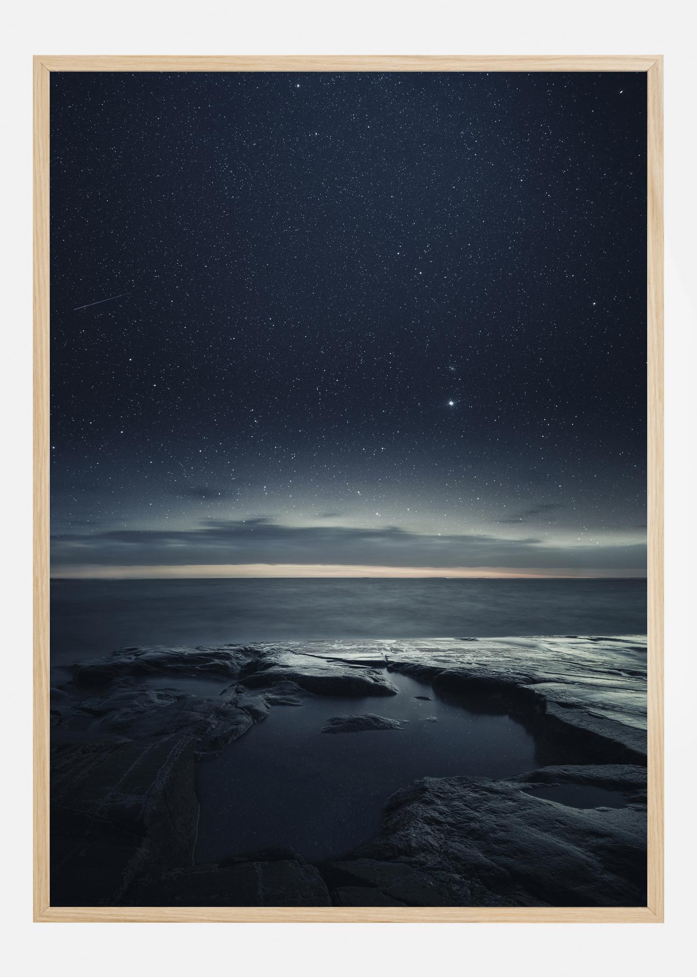 Ett fantastiskt tryck av en klippig strand med vatten som reflekterar den klara, lila himlen med glittrande stjärnor. Horisonten syns tydligt tack vare en vit ljusstråle som sträcker sig över havet. Detta är en sällsynt poster med kvällsmagi redo att ge lite fart i ditt hem.