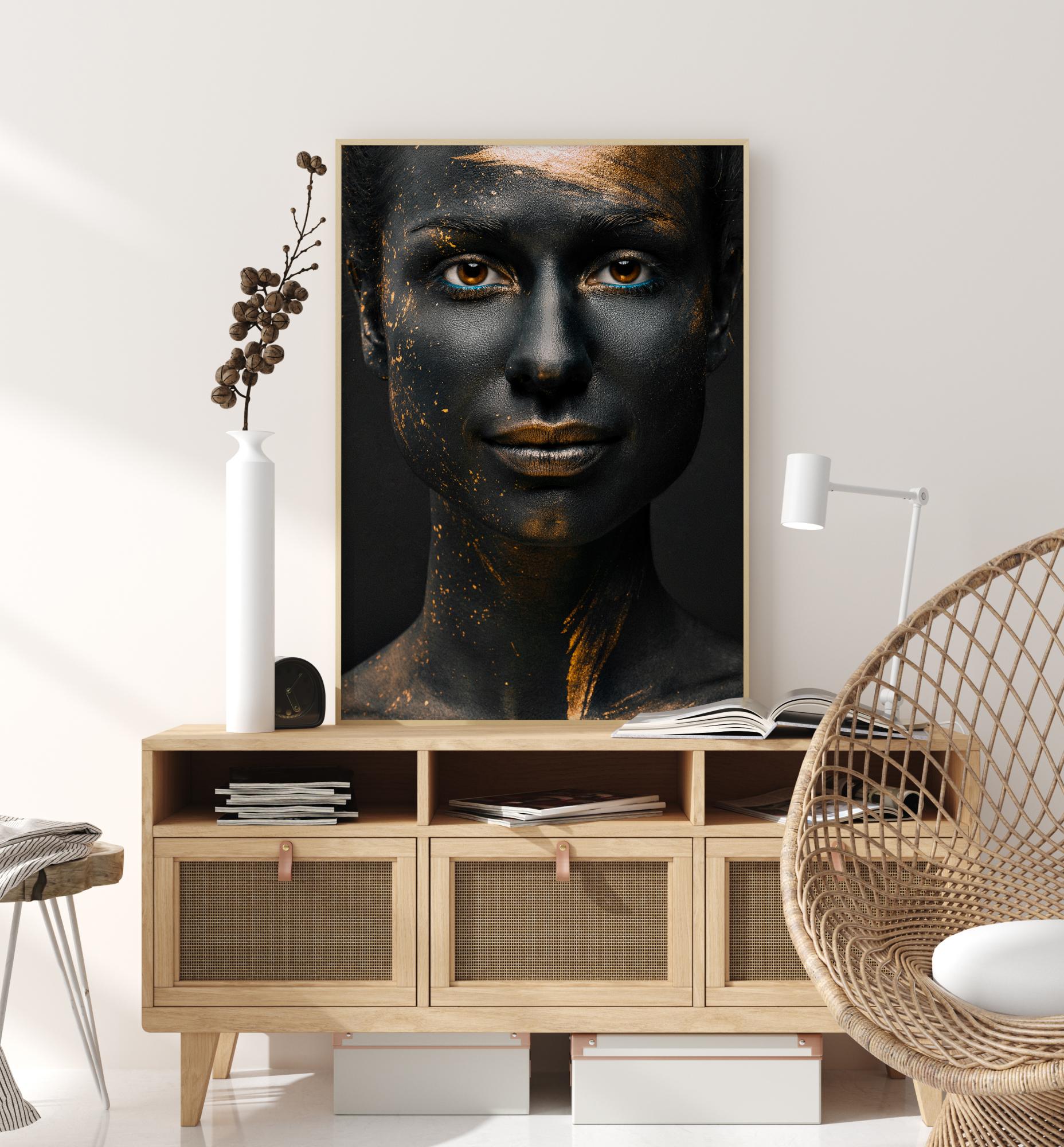 En svartvit porträttposter som gestaltar en leende dam med gråmålat ansikte. Kvinnans ansikte har stänkts med guldfärg på pannan, läpparna och halsen. Kvinnans ögon, som stirrar rakt in i kameran, har framhävts med blå eyeliner som skapar en intensiv blick. Det här vackra trycket visar en bild av perfekt skönhet som kommer att lysa upp ditt hem.