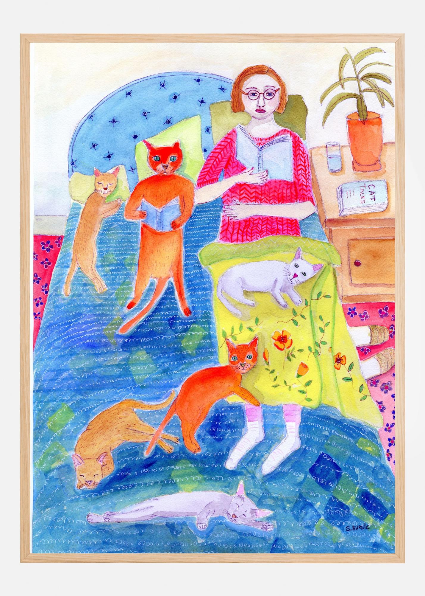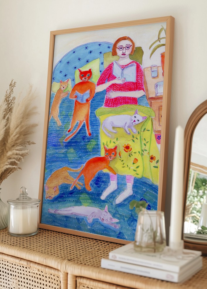 Motivet är fyllt med en harmonisk palett av färger som blått, rött, grönt, gult, och olika nyanser av brunt och grått. Det inkluderar detaljer som en stickad tröja och ett mönstrat täcke som ger djup till bilden. Denna färgglada affisch blir en fin accent till alla utrymmen där en lättsam och glad atmosfär önskas.