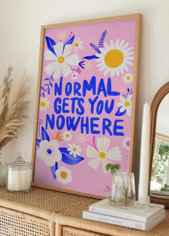 Denna livfulla poster sprider ett inspirerande budskap med texten "Normal Gets You Nowhere." Omringad av vackra, handritade blommor skapar den en dynamisk och upplyftande känsla. Denna print är ett perfekt tillskott för att addera lite färg och inspiration i vilket rum som helst.