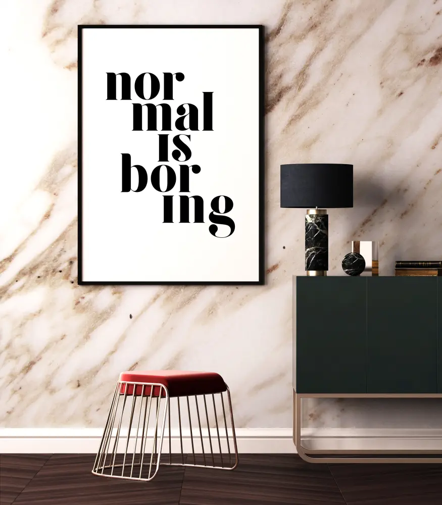 Ett svartvitt tryck för att främja ett budskap. "Normalt är tråkigt". På en vit bakgrund har orden delats upp i stavelser på fem olika rader. Ett starkt men enkelt budskap som kan tolkas som du vill. Häng den här enkla postern på en vit vägg i en modern miljö.