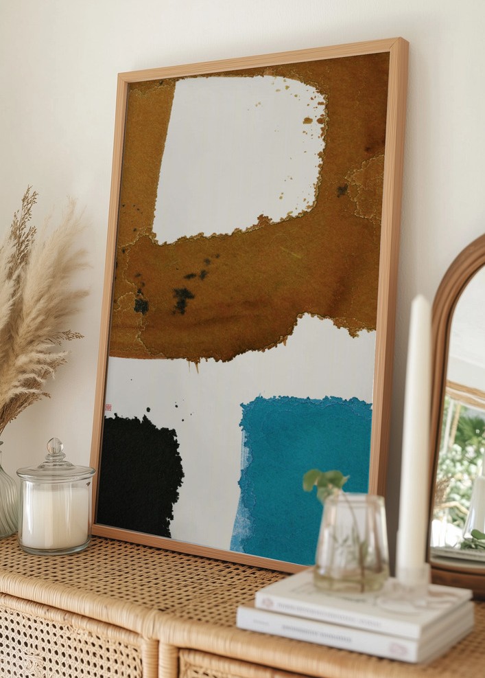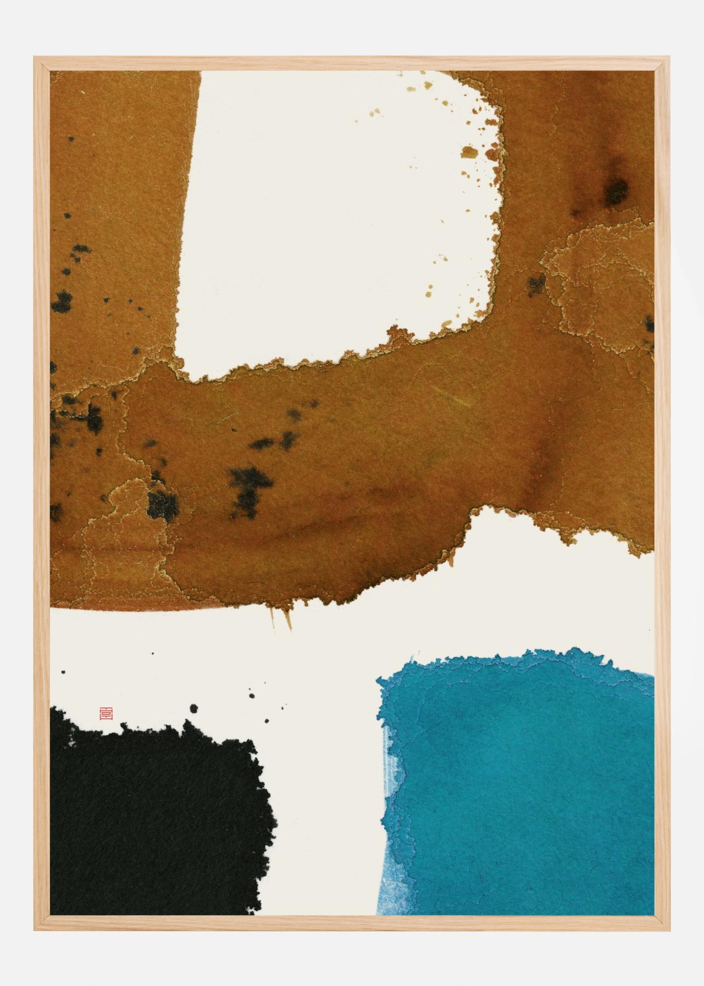 Denna print har även ett inslag av en klar blå nyans i det nedre högra hörnet, vilket ger ett fräscht pop av färg som bryter mot det annars dämpade färgschemat. Detta färgtillskott skapar en perfekt balans och ger liv till motivet. Denna posters harmoniska kombination av färger och former gör den till det idealiska valet för den som vill tillföra ett modernt och sofistikerat uttryck till sina väggar.