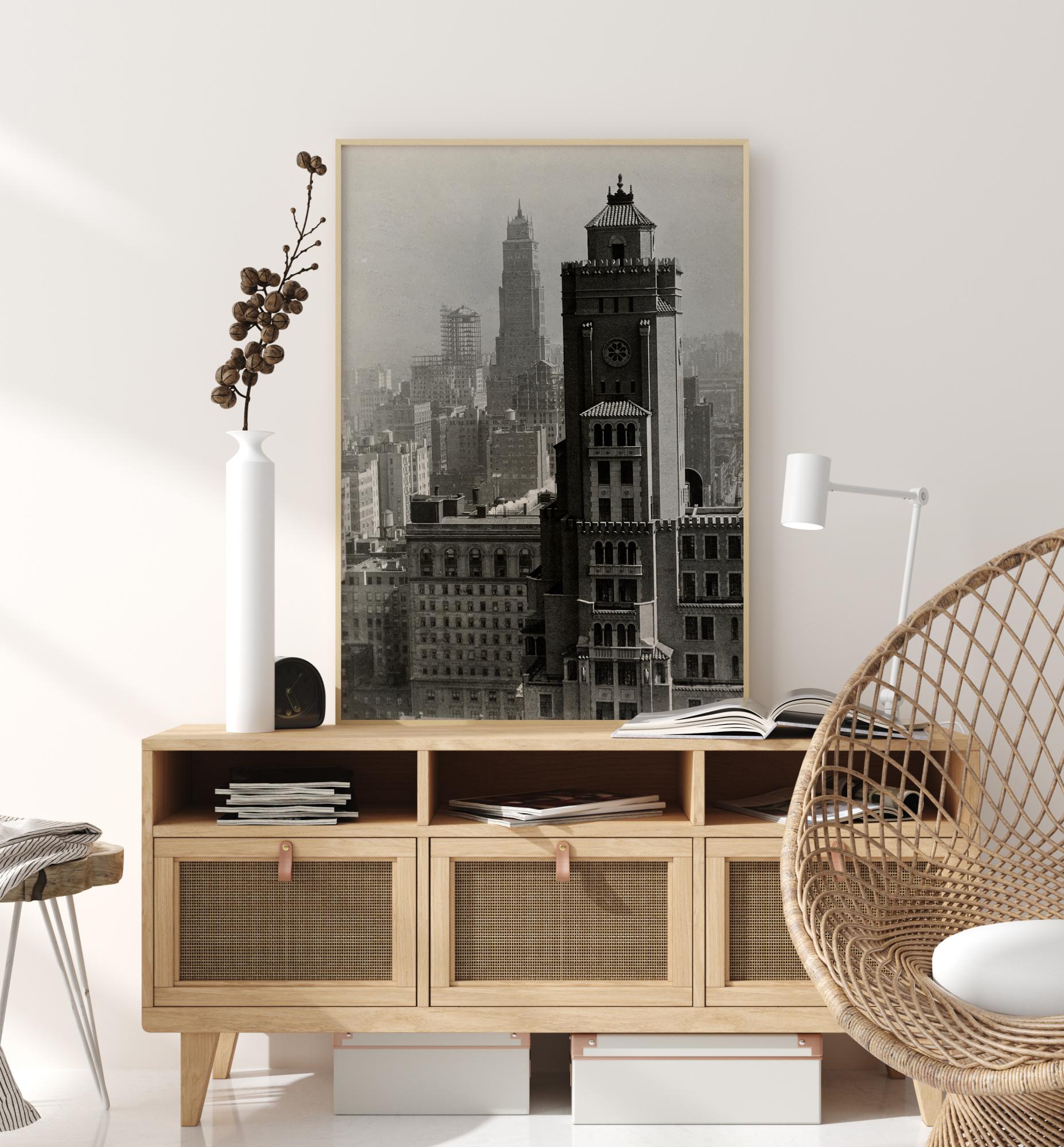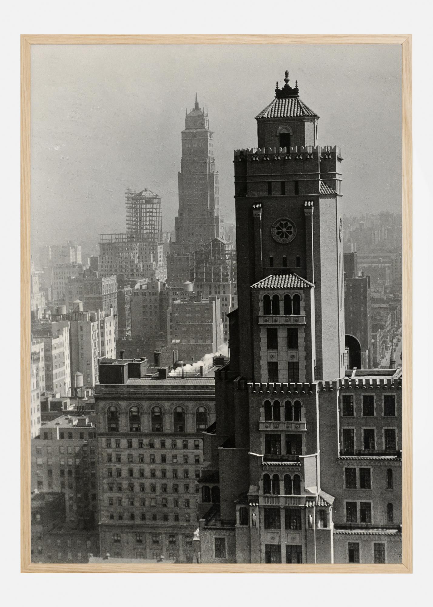 Ett svartvitt tryck med en gammal stad. Den grå stadslinjen smälter perfekt in med samma gråfärgade byggnader. Staden består av byggnader i olika höjder. I förgrunden skiner det naturliga ljuset direkt på huvudbyggnadens östra sida. Häng upp den här postern i ditt arbetsrum och observera den gamla staden.