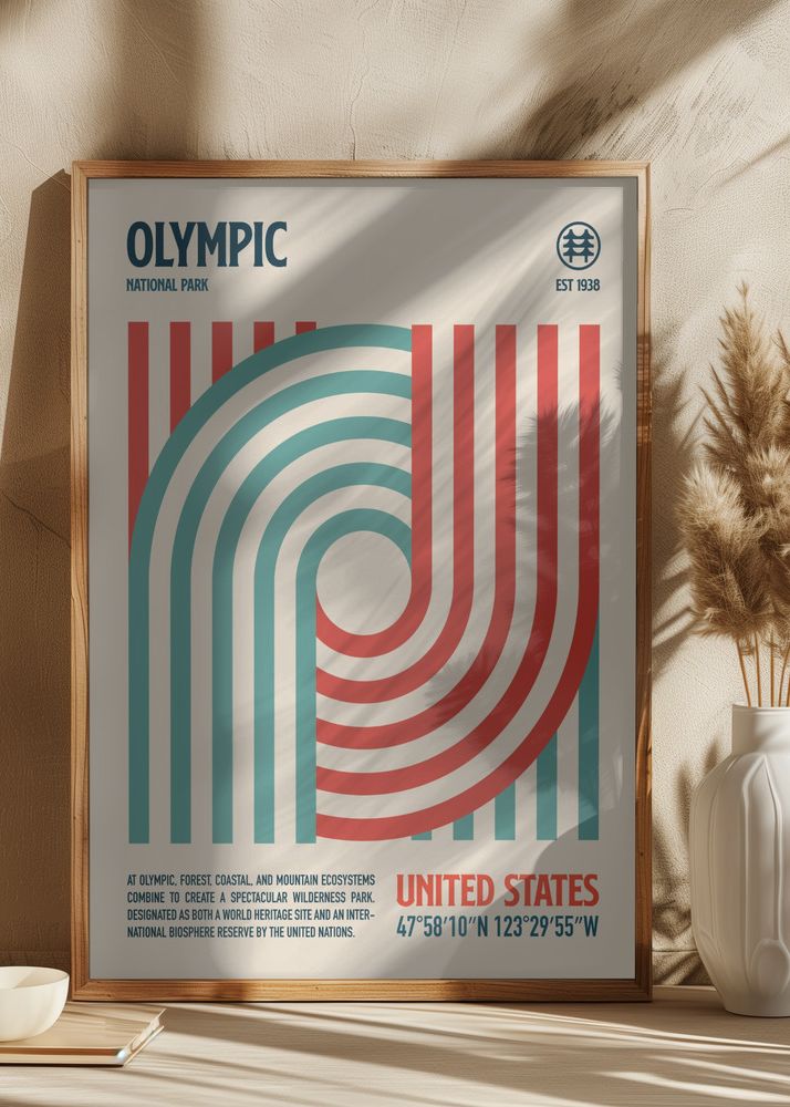 Upptäck vår retroinspirerade poster med motiv som hyllar den storslagna naturen i Olympic National Park, etablerat 1938. Designen tar dig tillbaka i tiden med sin klassiska stil och lekfulla grafiska representation av parkens skog, kustlinje och bergslandskap. Paletten av djupa röda, olika nyanser av grönt och en jordnära okerfärg skapar en känsla av äventyr och upptäckt, perfekt för alla naturälskare och retroentusiaster.
