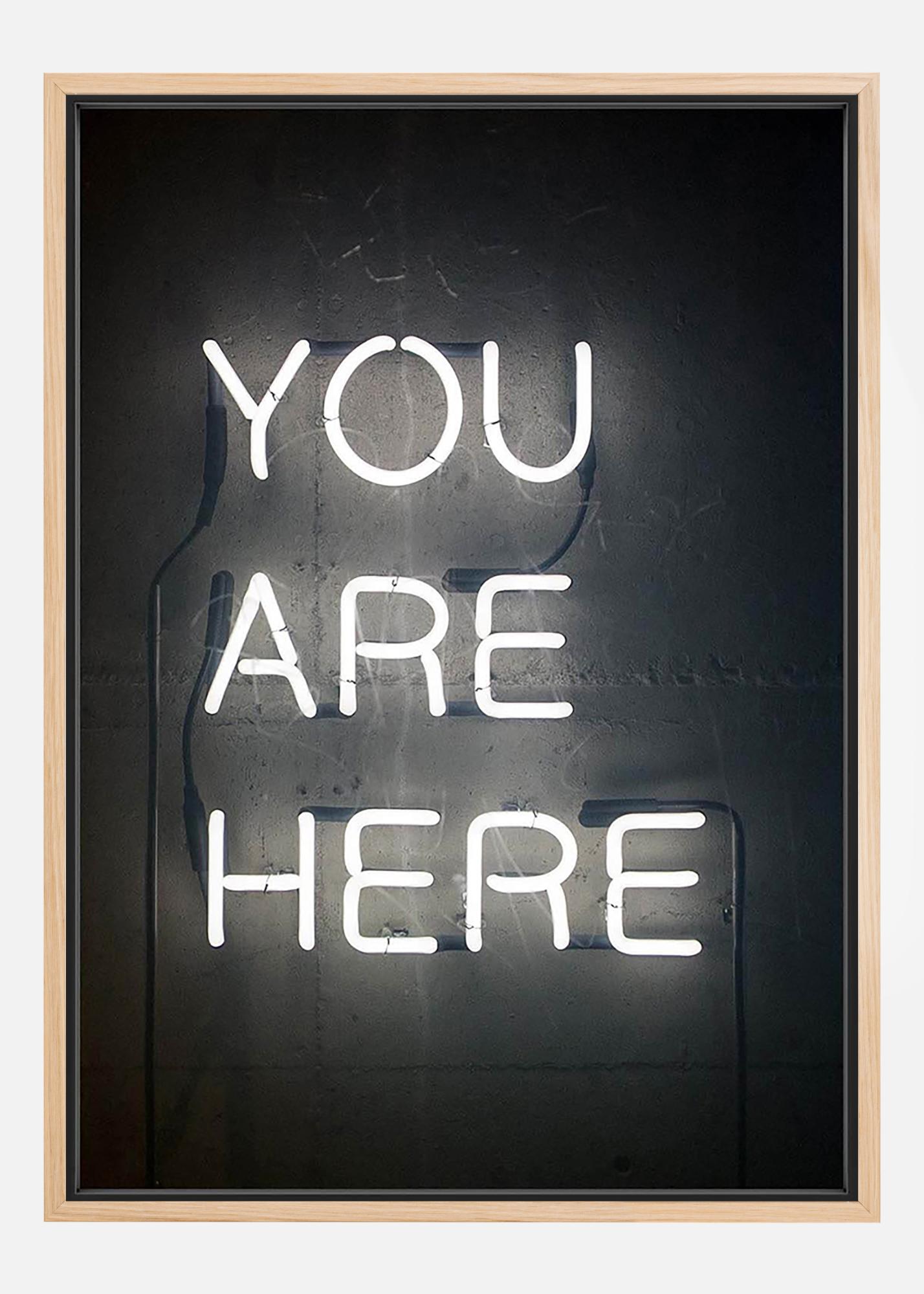 En svartvit text poster av en neonskylt med den informativa texten "You are here". En enkel och stilren tavla med ett trivsamt humoristiskt inslag, perfekt att kombinera med andra av våra fantastiska motiv på en större tavelvägg.