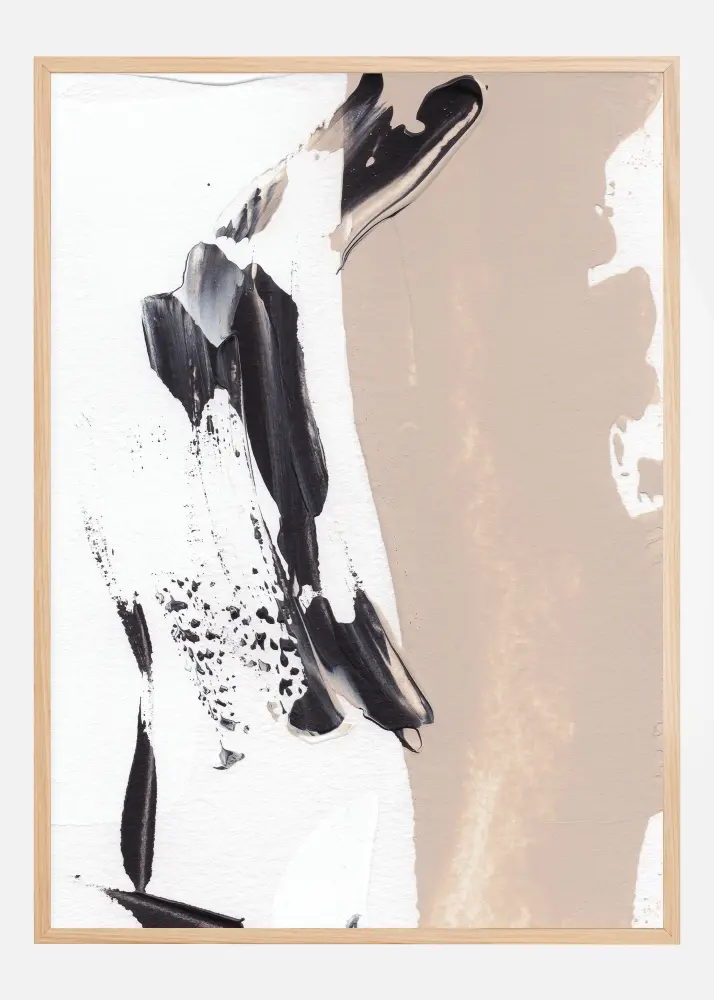 Denna djärva och expressiva poster är en firande av abstrakt konst och dess förmåga att väcka känslor och tolkningar. Den dynamiska kompositionen av svarta och gråa penseldrag mot den krämiga bakgrunden illustrerar rörelse och kreativitetens flyktiga natur. Spridda stänk och droppar lägger till en organisk känsla och visar konstnärens hand i varje linje och form.