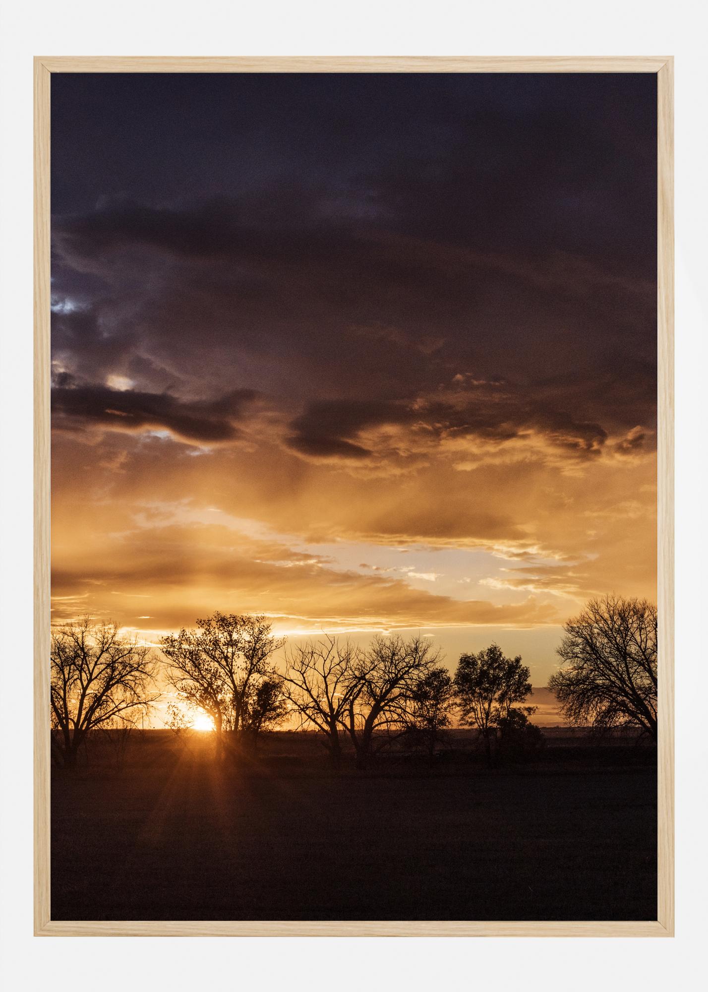 Ett hisnande tryck av en orange solnedgång. Solnedgången vid horisonten framhäver höstträden på fälten. Med en spektakulär himmel skapar de orange nyanserna en varm och lugnande atmosfär. En fantastisk poster som ger värme i ditt vardagsrum.