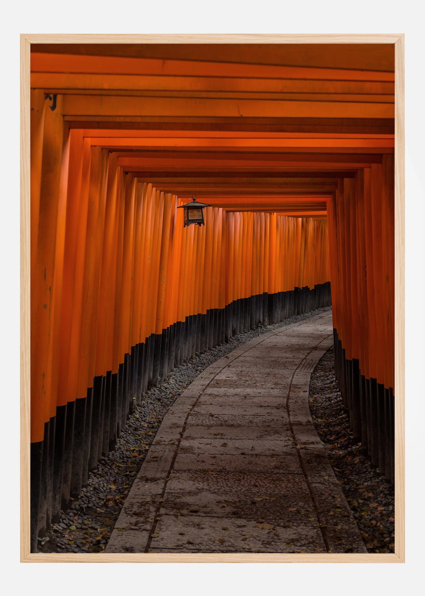 En poster med en stengång som kantas av orange och svarta trästöttor. I mitten av gången hänger en lykta av järn. Det naturliga ljuset skiner på gången där några små höstlöv har fallit. Ett vackert tryck som kan liva upp vilken vägg som helst.