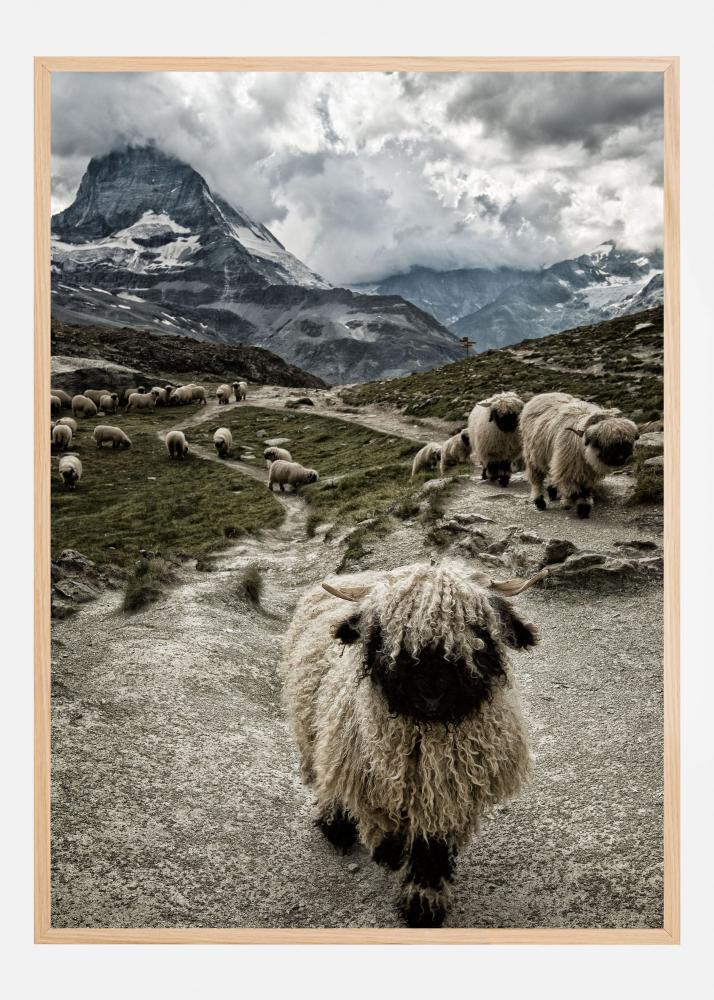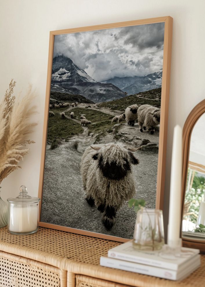 Denna affisch fångar det rofyllda och naturliga landskapet i en bergsmiljö med en flock får i förgrunden. Bilden framhäver fårens ulliga textur och deras lugna vandring genom det karga landskapet. Motivet förmedlar en känsla av stillhet och enkelhet, vilket gör det till en idealisk poster för att skapa en avslappnad atmosfär i ditt hem eller kontor.