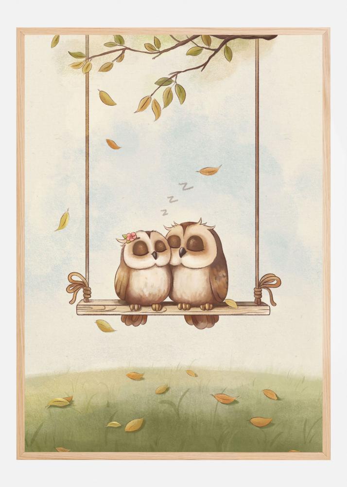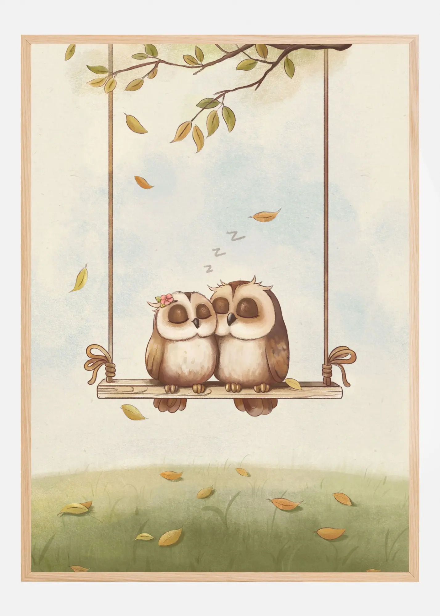 Denna charmiga poster porträtterar två bedårande ugglor som delar en stund av stillhet på en gungbräda, omgivna av en idyllisk natur. Illustrationen präglas av mjuka pasteller med en övervägande användning av beige, brun, och gyllene toner, som förmedlar en känsla av värme och ro. De fredfulla ögonblicken fångade i denna print skapar en lugnande och inbjudande atmosfär, perfekt för att tillföra en känsla av harmoni i vilket rum som helst.