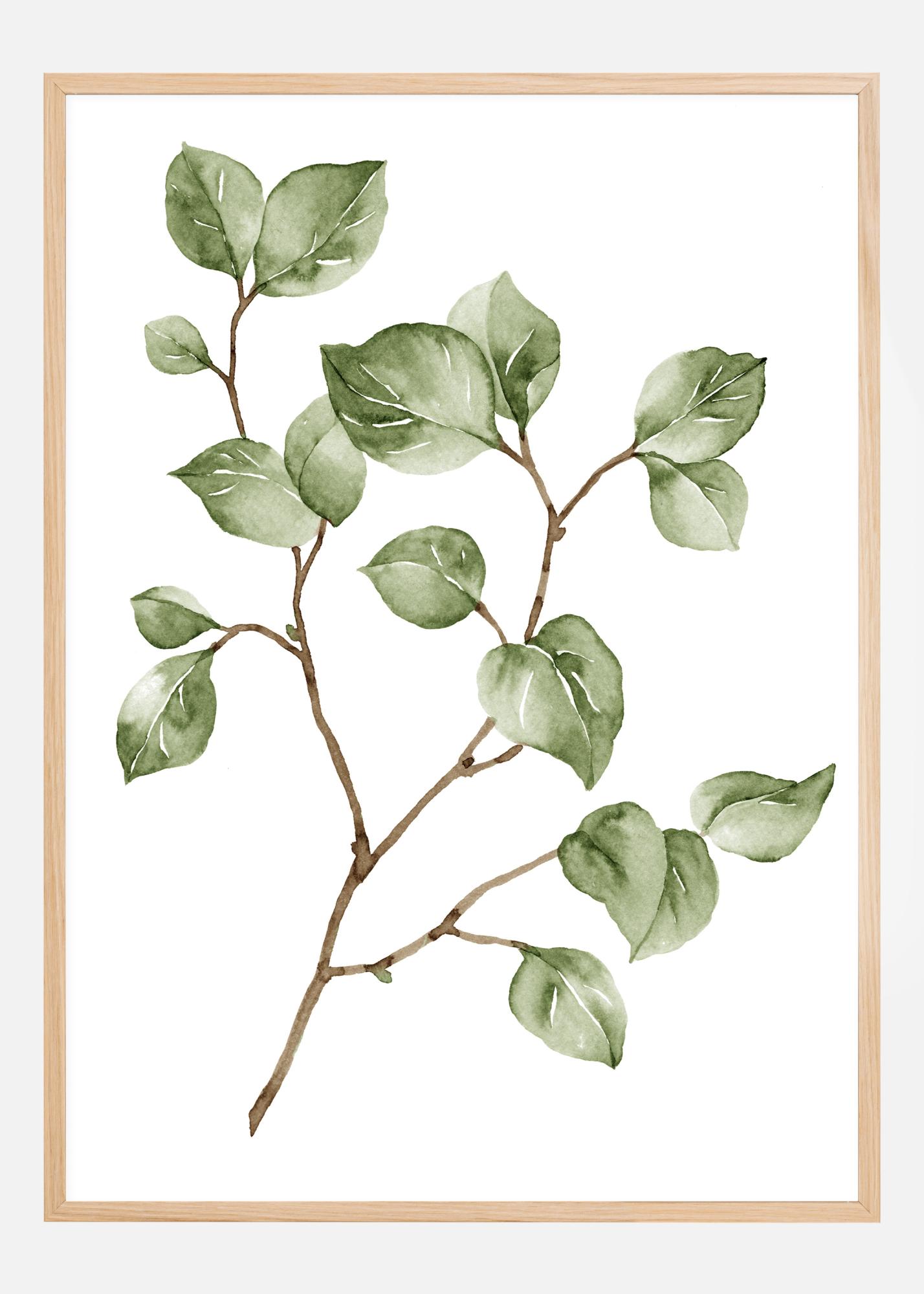 En vacker poster med en tunn brun gren med små gröna blad. Målad på en vit yta framhäver de mjuka bruna och gröna färgerna de delikata vita ådrorna på bladen. Ett vackert tryck att hänga på en ljusgrön vägg.