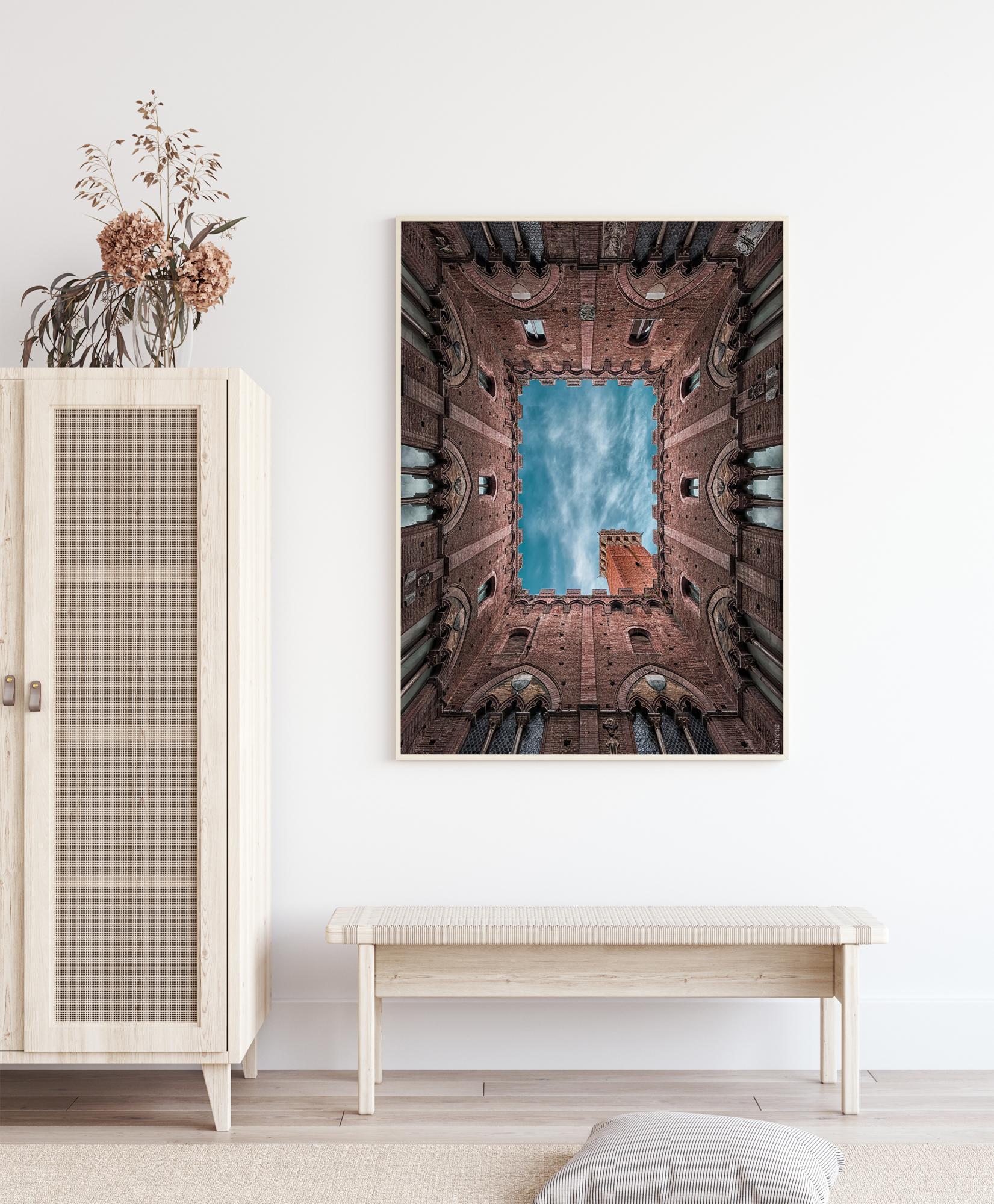 En perspektivposter, nerifrån och upp av Palazzo Pubblico i Siena, Italien. Med den ljusblå himlen som lyser klart och tydligt syns de gotiska fönstren tydligt på varje sida av byggnaden. När du tittar upp mot himlen kan du lägga märke till det magnifika klocktornet. Ta in lite italiensk arkitektur i ditt hem med hjälp av det här fantastiska trycket.