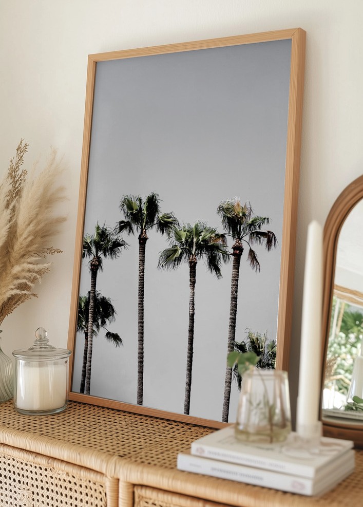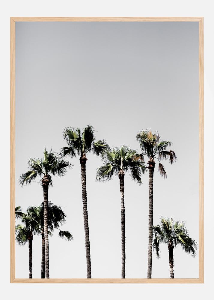 Denna eleganta poster fångar essensen av en tropisk oas med sina ståtliga palmer som sträcker sig mot en klar himmel. De smäckra träden ger en känsla av lugn och semester, vilket gör detta print perfekt för den som vill skapa en avkopplande atmosfär i hemmet. Det minimalistiska motivet passar in i både modern och klassisk inredning, vilket gör det till ett mångsidigt tillskott i vilket rum som helst.