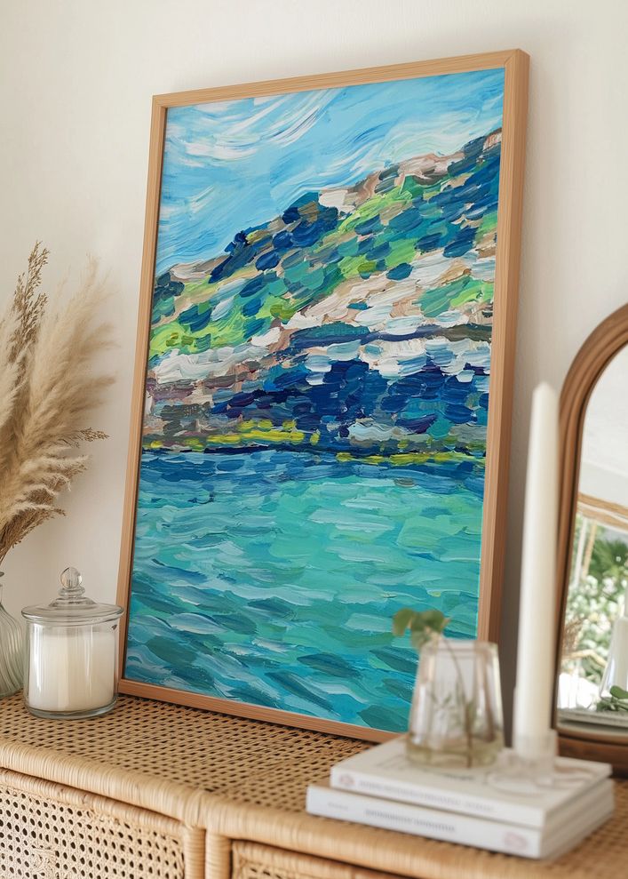 Denna livfulla poster fångar essensen av en lugn kustlinje med sina svepande penseldrag. De turkosa och azurblå nyanserna i vattnet speglar en klar och fridfull dag vid havet. Berget i bakgrunden är målat med en palett av gröna, blåa och jordnära toner, vilket skapar en harmonisk kontrast mot den klarblå himlen.