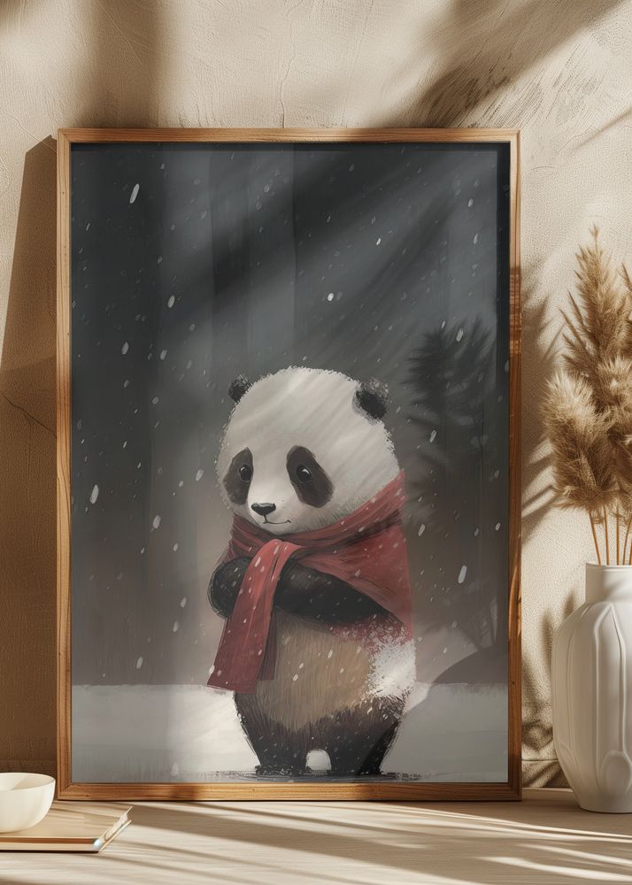 Ge ditt rum en känsla av värme och charm med denna bedårande poster som presenterar en ensam panda med en livlig röd halsduk. Den här printen fångar den ljuva essensen av en panda i vintertid, omgiven av ett försiktigt snöfall som lägger sig mjukt på marken. Föreställningen spelas upp mot en lugn bakgrund i nyanser av grått och brunbeige, vilket ger en känsla av lugn och stillhet. Pandaens svartvita päls kontrasterar vackert mot den mjuka bakgrunden och den röda halsduken ger en fin pop av färg.