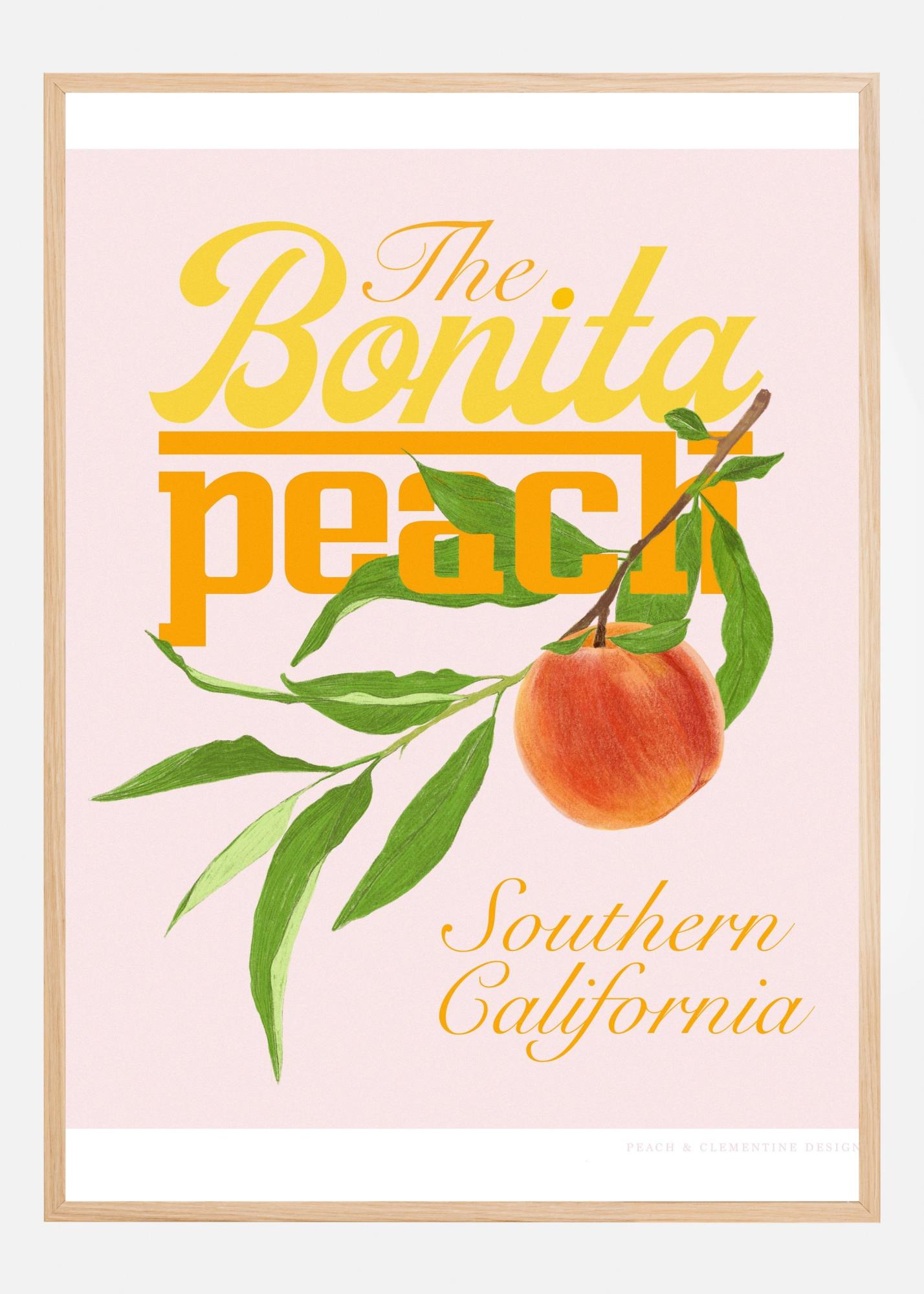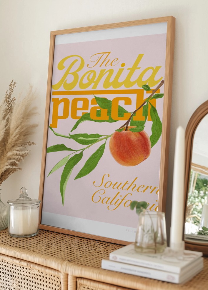 Denna affisch utstrålar en retro och färgglad estetik som för tankarna till soliga dagar i södra Kalifornien. Centralt i motivet är en saftig persika, hängandes från en gren med frodiga gröna blad. Bakgrunden är ljusrosa, vilket ger en mjuk och inbjudande känsla. Orden "The Bonita Peach" framträder tydligt i en djärv gul-orange text, medan "Southern California" är skrivet i en elegant skrivstil i samma nyans. Detta skapar en harmonisk kombination som väcker nostalgi och stil.