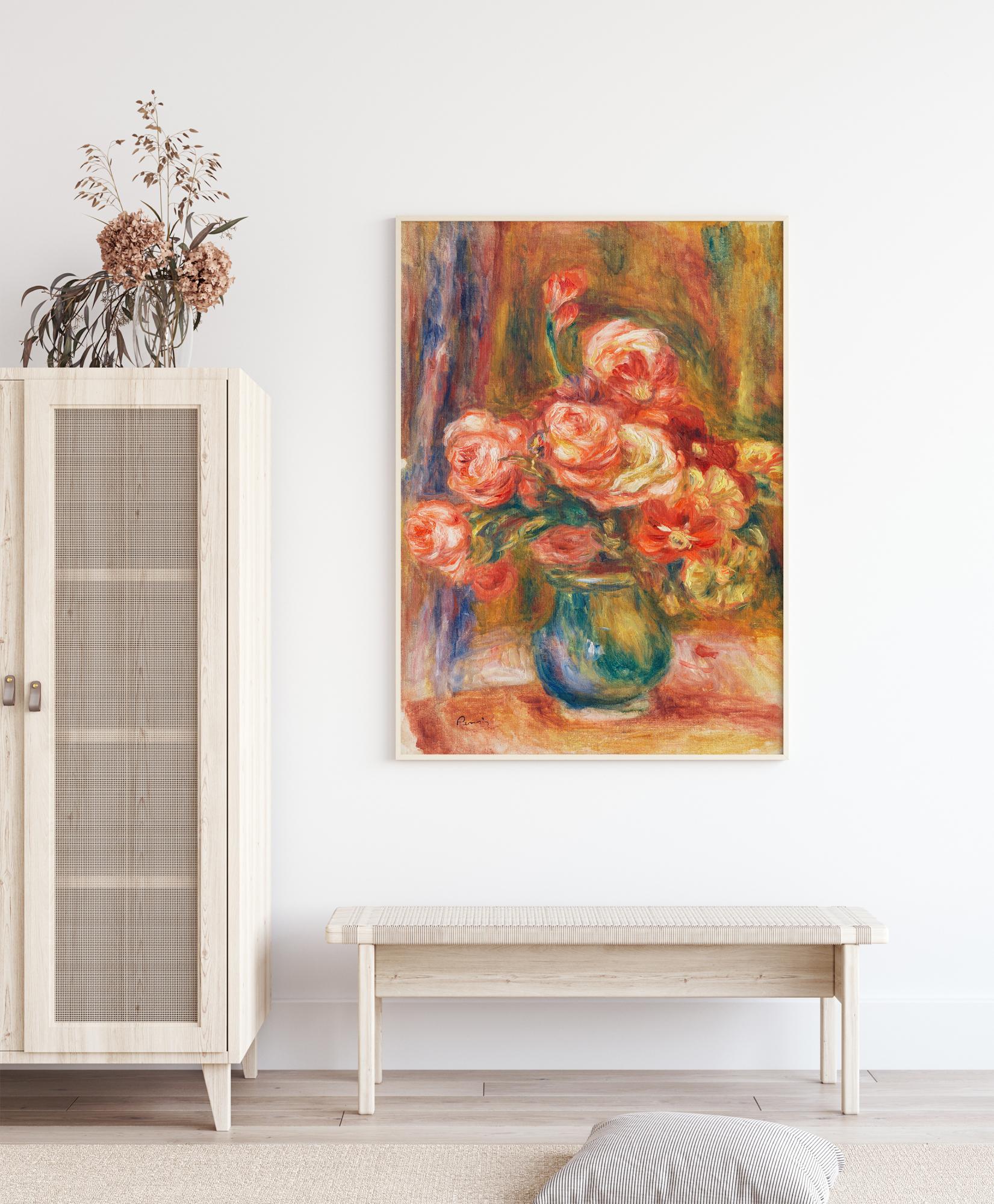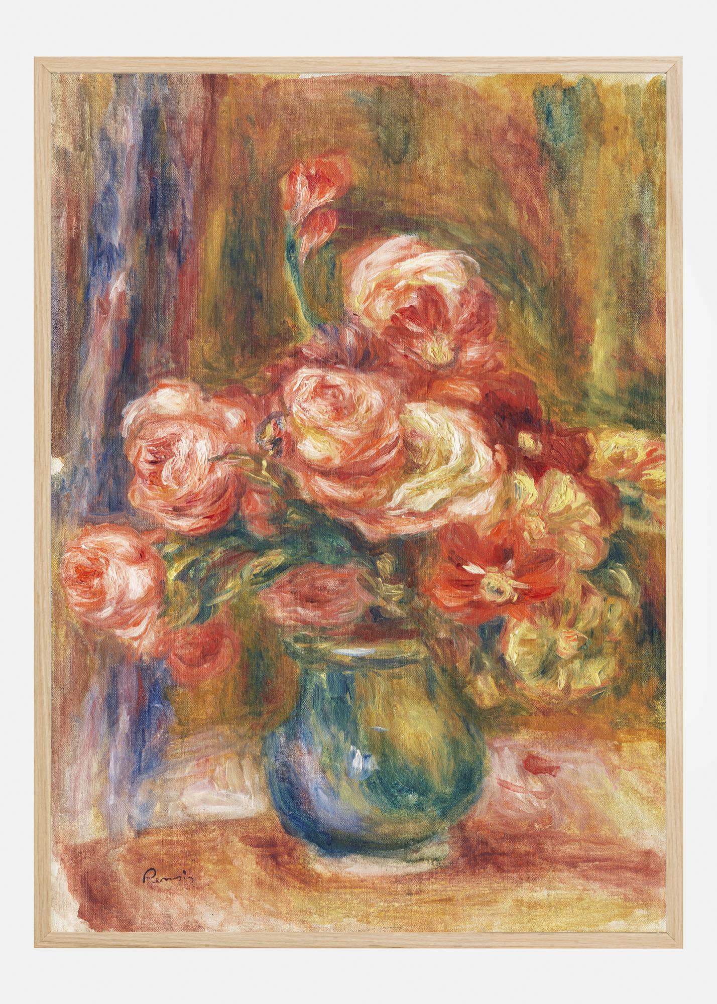 En vacker handmålad rosenbukett. Detta fantastiska tryck av orange och röda rosor i en grön och färgad vas skapar en varm och lugnande känsla. Kombinationen av färger på en flerfärgad bakgrund smälter alla perfekt in i varandra. Få ditt hem att glöda med hjälp av den här härliga postern.