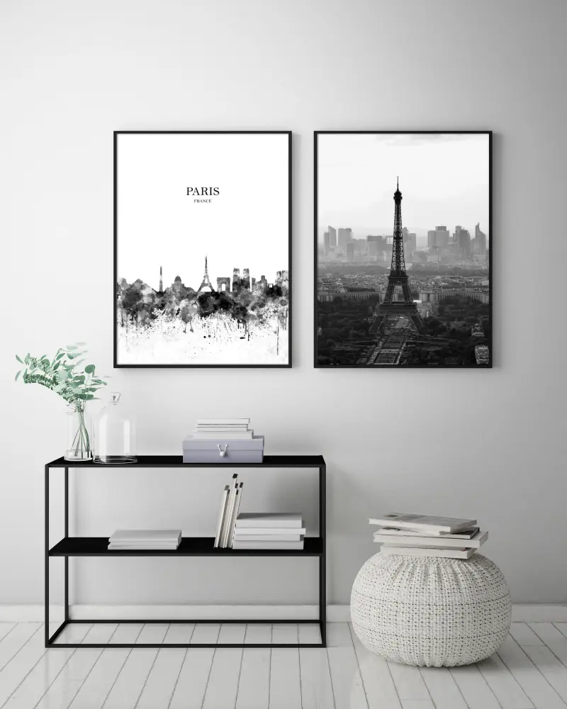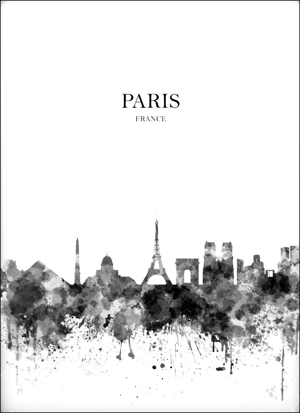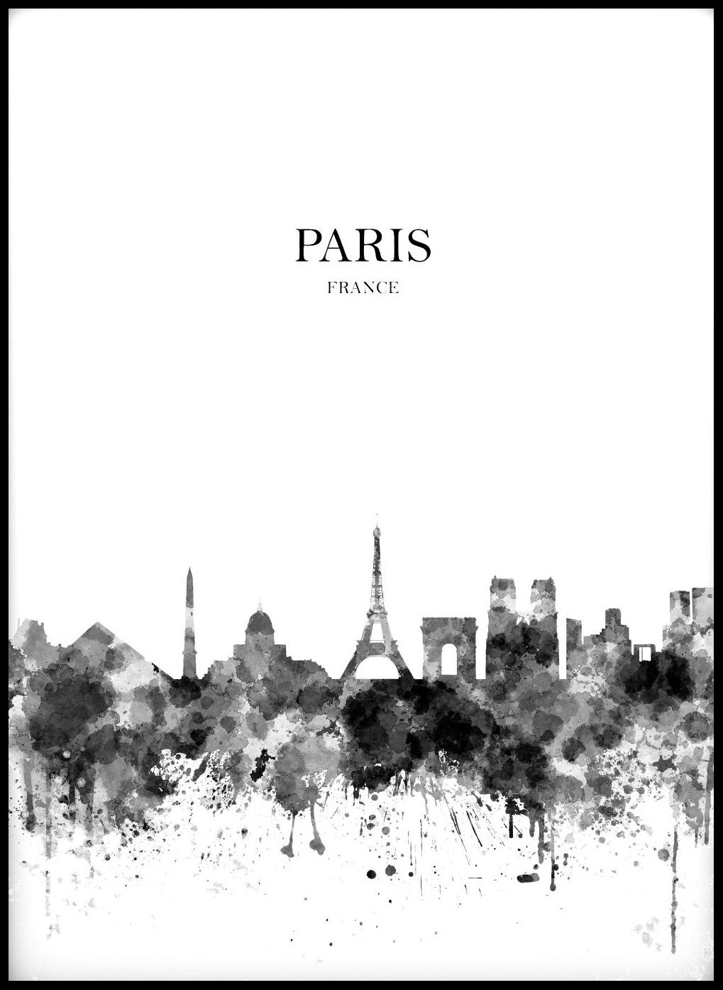 Grafiskt print med en skyline av modets huvudstad Paris. Motivet har en känsla av att vara skapat av urvattnat bläck, med rinningar och droppar som dekorativt inslag. Överst står stadens namn och land, med ett klassiskt snyggt typsnitt. Den grafiskt stilrena affischen är perfekt att använda som en del av en tavelvägg med ett tema kring staden eller landet. Köp till en fotoram i svart eller vitt som framhäver det svartvita motivet och som gör sig bra i de flesta inredningar.
