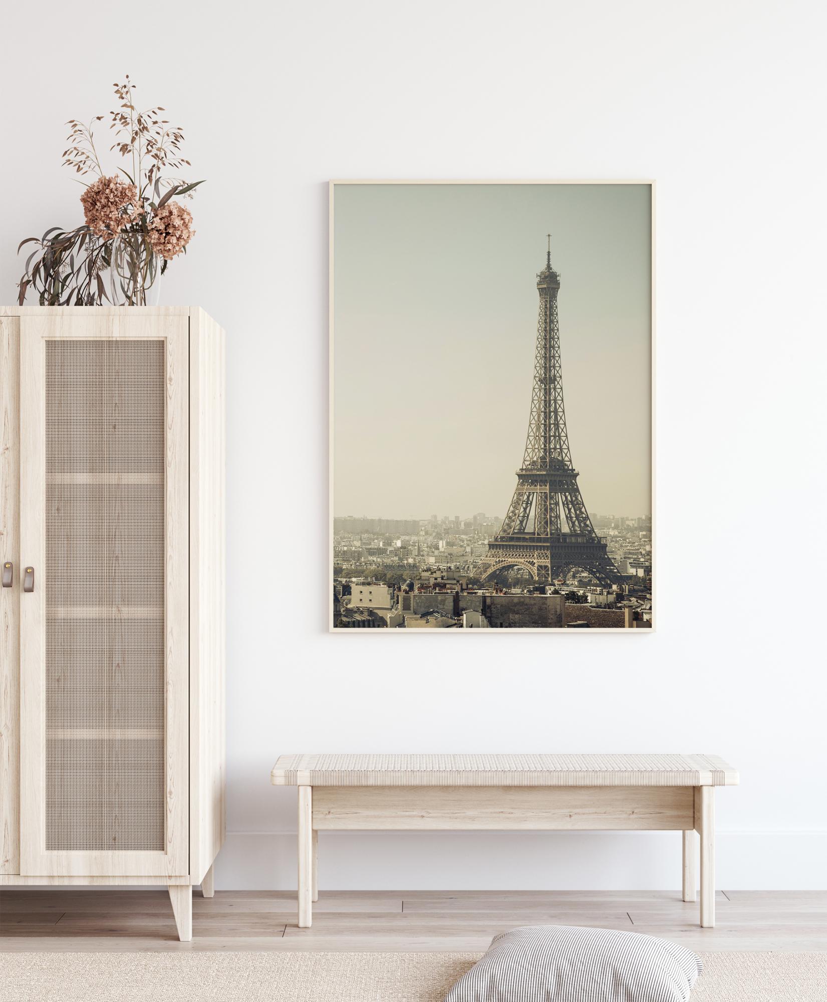 En spektakulär poster med Eiffeltornet. Den mulna himlen förstärker skönheten hos denna spektakulära arkitektoniska struktur. De omgivande byggnaderna smälter perfekt in i den svartvita designen på det här trycket. Föreställ dig utsikten från toppen av denna byggnad när du hänger upp detta tryck i ditt hem.