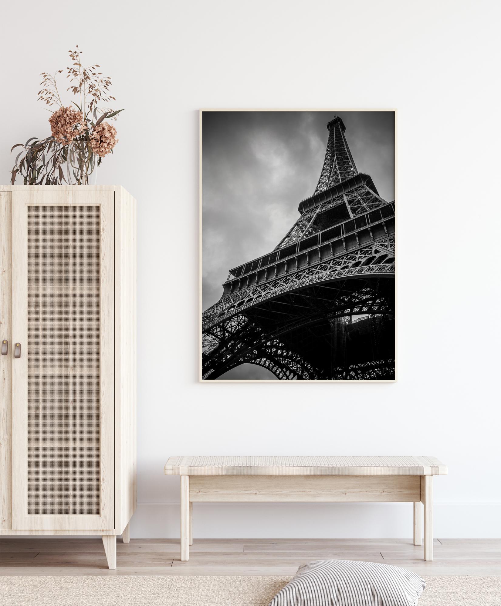 En perspektivposter nerifrån det hisnande Eiffeltornet. Med den molniga grå himlen visar denna vackra järnstruktur upp sin pyramidliknande form när den reser sig högt. För alla som älskar Paris är detta ett perfekt tryck att ge i present.