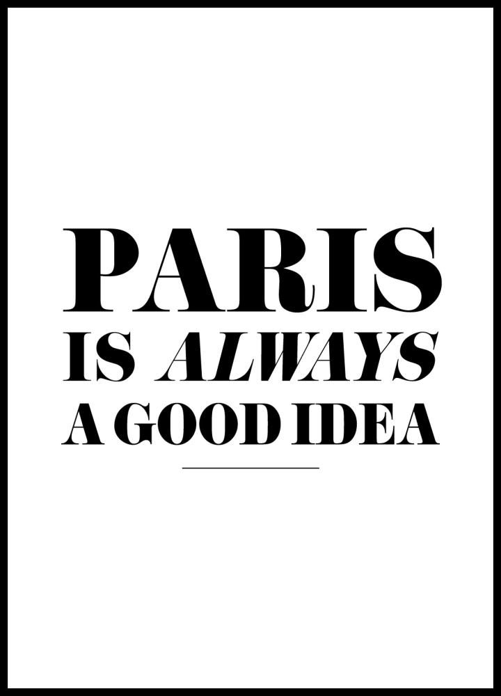 Regnet smattrar mot kontorsrutan och texten på datorn flyter ihop till en enda svart massa. Det kryper i din kropp av tristess och varken bensträckare eller kaffe hjälper. Men så kastar du ett öga på den lilla bilden på skrivbordet och den jobbiga känslan byts ut mot drömmar. Du kan alltid ta en långhelg till Paris! Denna härliga print har texten ”Paris is always a good idea” tryckt med svarta versaler mot en vit bakgrund. Sätt upp den som den är eller komplettera med någon av våra högkvalitetsramar. Finns i flera olika format, så du kan vara säker på att du hittar den storlek som passar just dig.