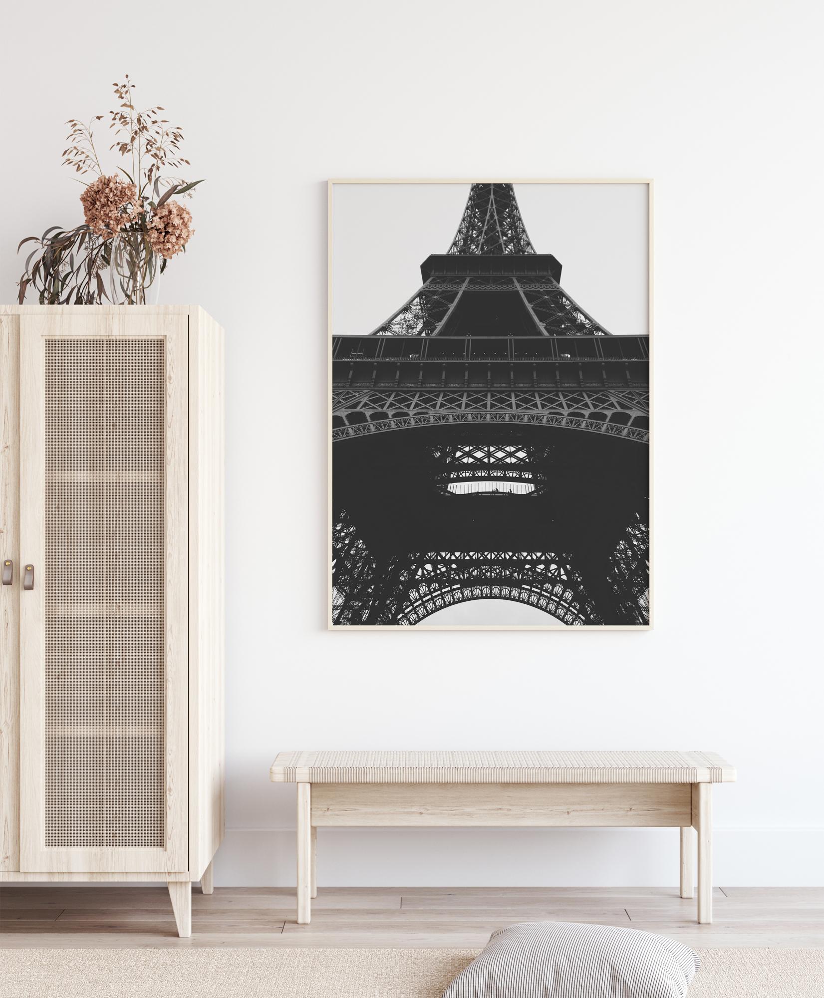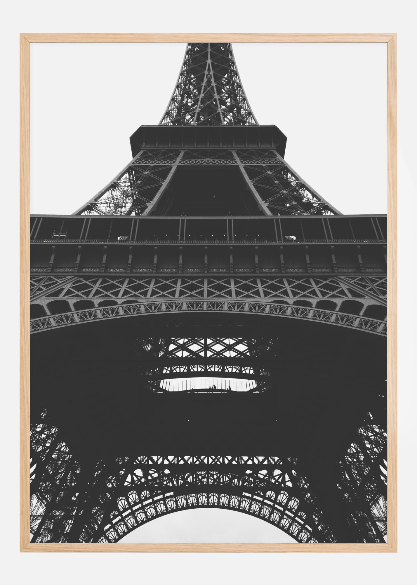 En fantastisk svartvit poster med Eiffeltornet. Bilden på den massiva järnstrukturen är tagen från ett grodperspektiv låter tornet smälta perfekt in mot den grå himlen. Det här tekniska mästerverket skapar en lätt, luftig och stark struktur. Ett perfekt tryck att hänga upp i en modern miljö.