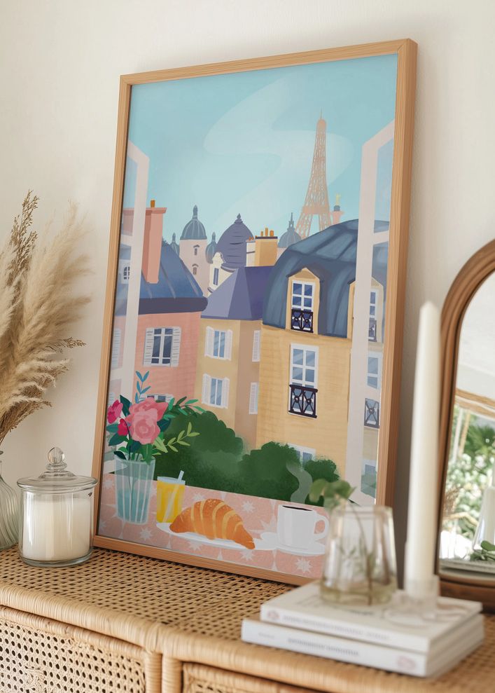På bordet framför fönstret står en bukett av rosor i rosa och rött, ett glas apelsinjuice, en nybakad croissant och en kopp rykande kaffe, vilket skapar en inbjudande frukostscen. Dessa element i printet bidrar till en känsla av vardaglig lyx och livsnjutning. Affischen, med sin harmoniska färgpalett och detaljer, passar perfekt för den som vill tillföra en bit av Paris elegans till sitt hem.