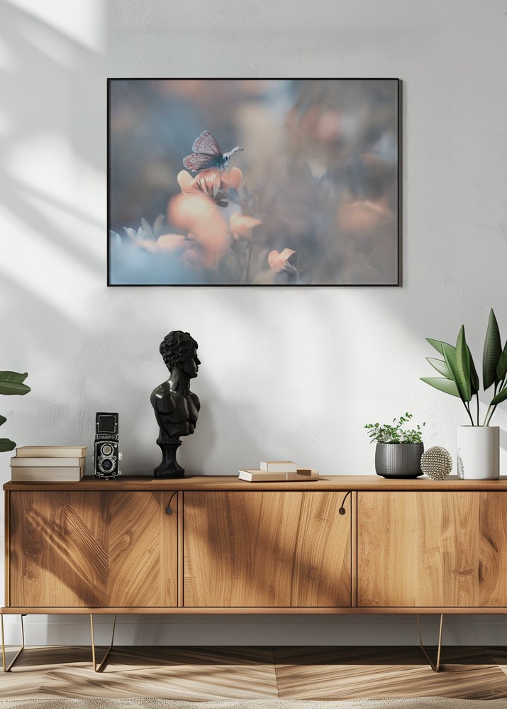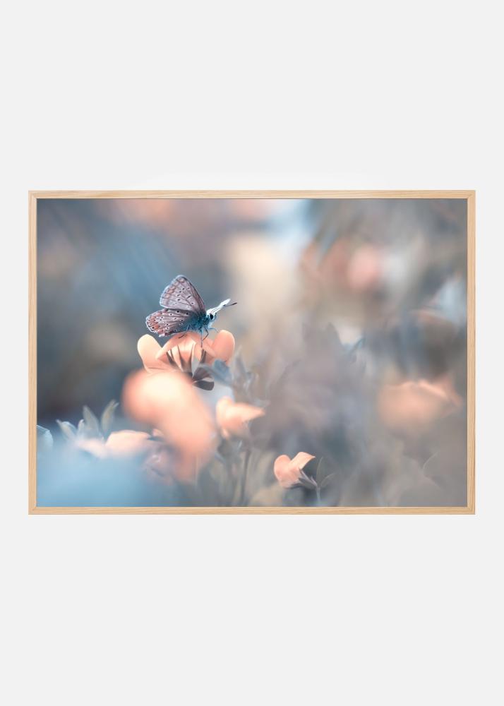 Upptäck skönheten i vår poster som fångar en förtrollande scen med en fjäril vilande på en blomma. Denna bild utstrålar en lugnande känsla och är perfekt för att skapa en rofylld atmosfär i ditt hem eller kontor. Detaljerna i fjärilens vingar och blommans kronblad förstärker det drömska intrycket och gör denna affisch till ett konstnärligt tillskott i din inredning.
