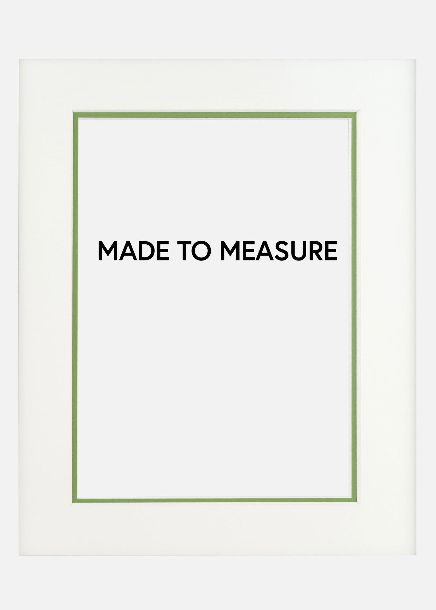 Måttbeställd passepartou i två lager med en vit passepartou som bas och ett undre lager i grön som ger en färgad kant på 5 mm runtom bilden. Perfekt när du vill göra en effektfull inramning som framhäver din bild och ger ett extra djup till motivet. Alla våra passepartouter har snyggt skurna kanter i 45 graders vinkel vilket ger en seriös och professionell inramning till dina bilder.