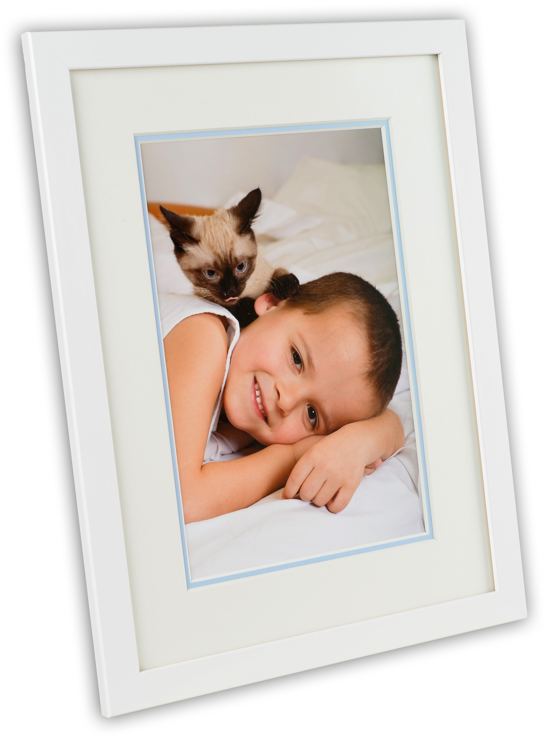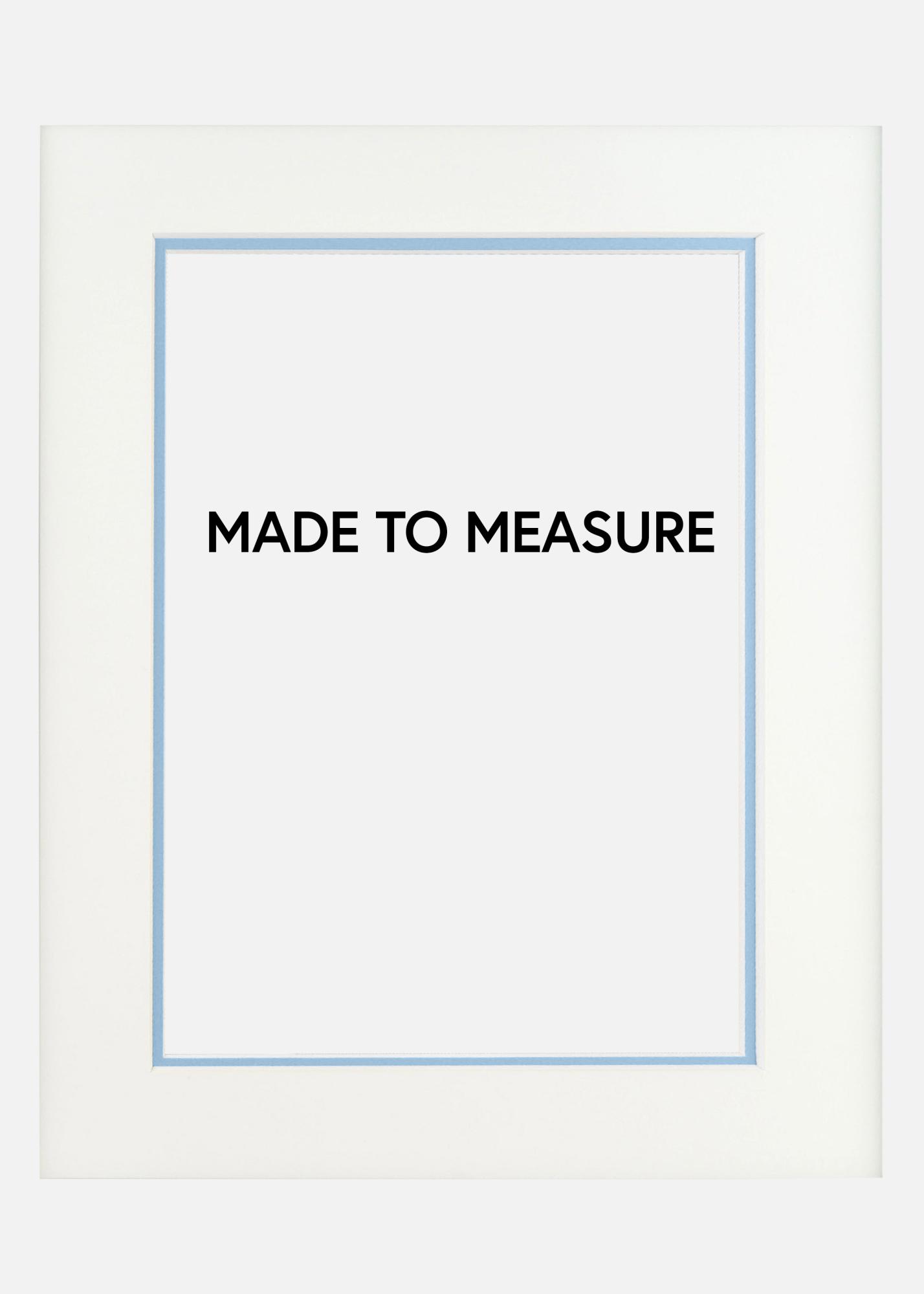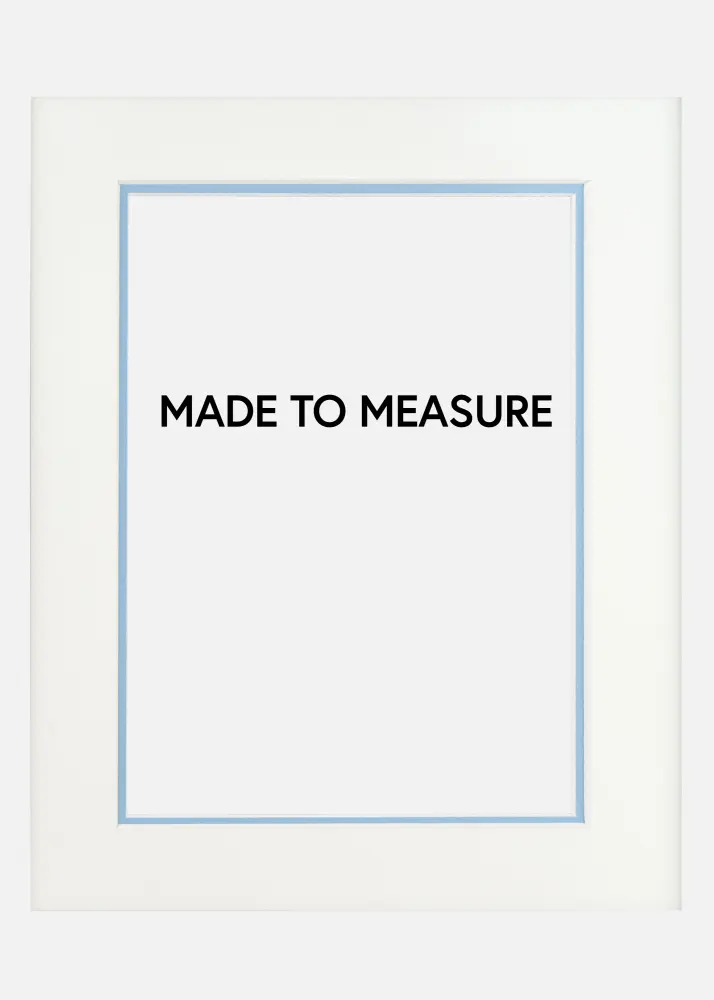 Måttbeställd passepartou i två lager med en vit passepartou som bas och ett undre lager i ljusblått som ger en färgad kant på 5 mm runtom bilden. Perfekt när du vill göra en effektfull inramning som framhäver din bild och ger ett extra djup till motivet. Alla våra passepartouter har snyggt skurna kanter i 45 graders vinkel vilket ger en seriös och professionell inramning till dina bilder.