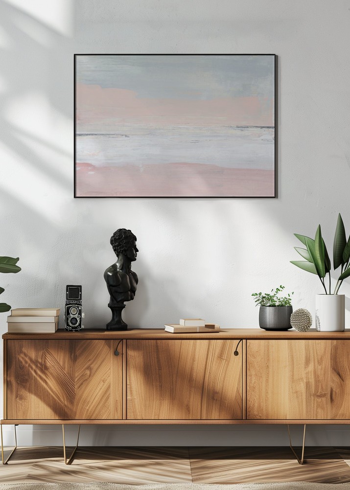 Denna poster fångar en stillsam och harmonisk känsla genom sina subtila pastellnyanser. Motivet visar mjuka övergångar mellan rosa och gråa toner, vilket skapar en lugnande effekt som passar perfekt i alla moderna hem. Denna affisch är idealisk för att tillsätta en känsla av elegans och lugn i vilket rum som helst.
