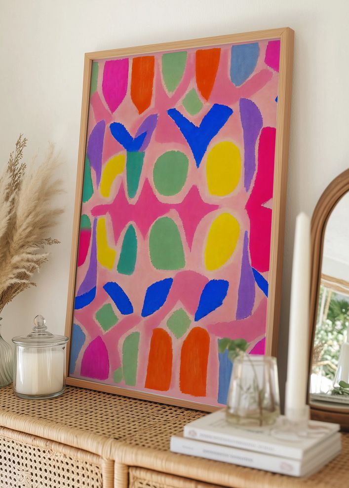 Denna livfulla poster erbjuder en explosion av färger och kreativa former som lockar ögat och skapar ett unikt intryck. Motivet präglas av en harmonisk blandning av rosa, blå, gul, grön och lila, vilket ger en energisk och glad atmosfär. De abstrakta figurerna i detta print är perfekt för att lägga till en färgstark och modern touch till vilket rum som helst.