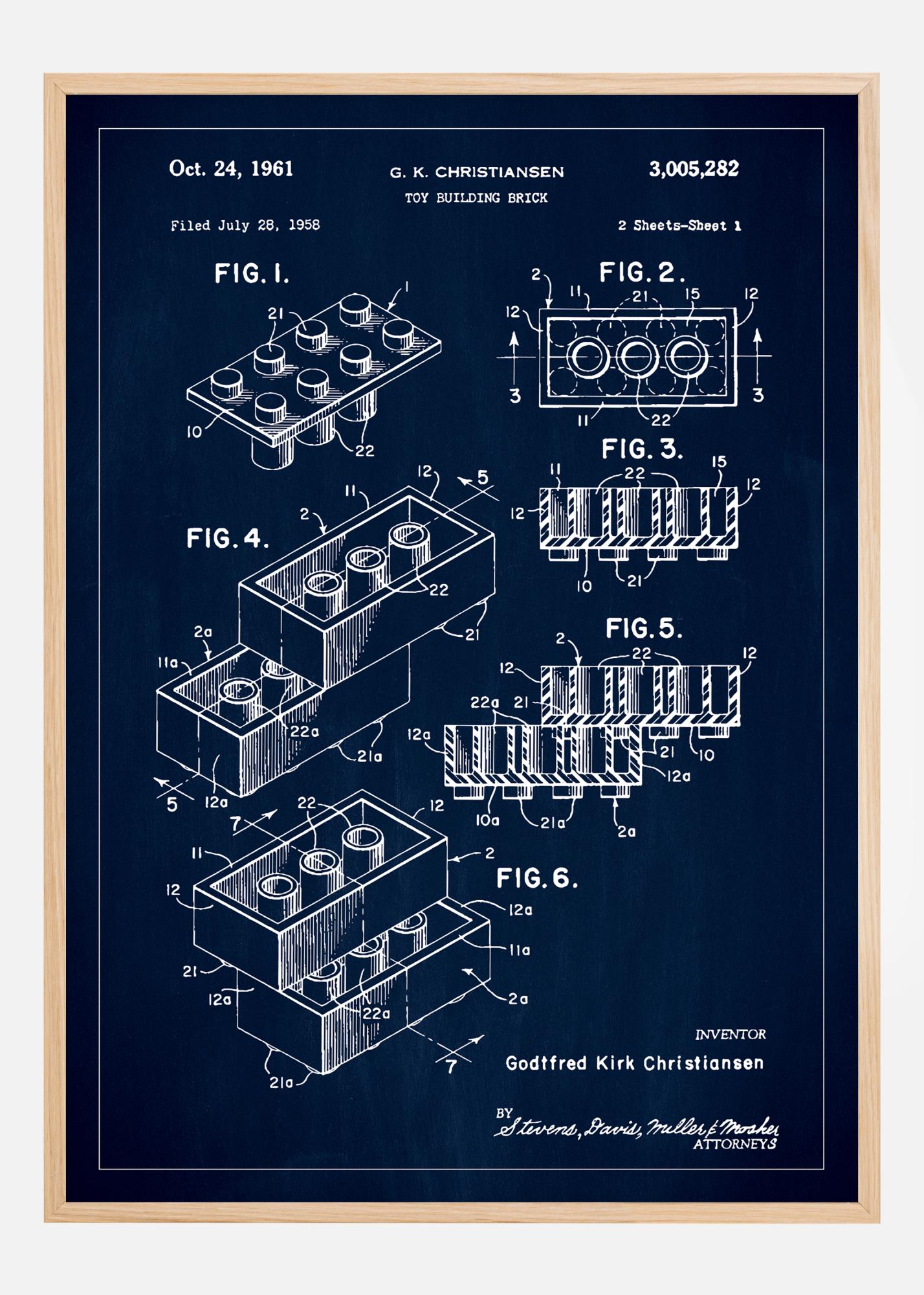 Denna detaljrika patentposter avbildar den geniala designen av leksaksbyggklossen från Lego som förändrade spelet för kreativt lekande och lärande, skapad av Godtfred Kirk Christiansen. Med patentnumret 3,005,282, beviljat den 24 oktober 1961, fångar denna illustration essensen av en uppfinning som har inspirerat och glatt generationer av byggare och tänkare.