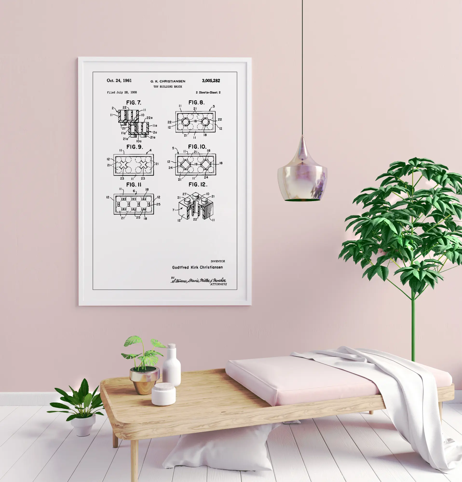 Denna patentposter återspeglar en verklig revolution inom lek och kreativitet. Den visar patentet för en leksaksbyggkloss från LEGO, beviljat den 24 oktober 1961 under nummer 3,005,282, designad av uppfinnaren Godtfred Kirk Christiansen. Det är en fantastisk homage till en enkel, men djupt inflytelserik design som har fört samman och inspirerat barn och vuxna över hela världen att bygga och skapa.