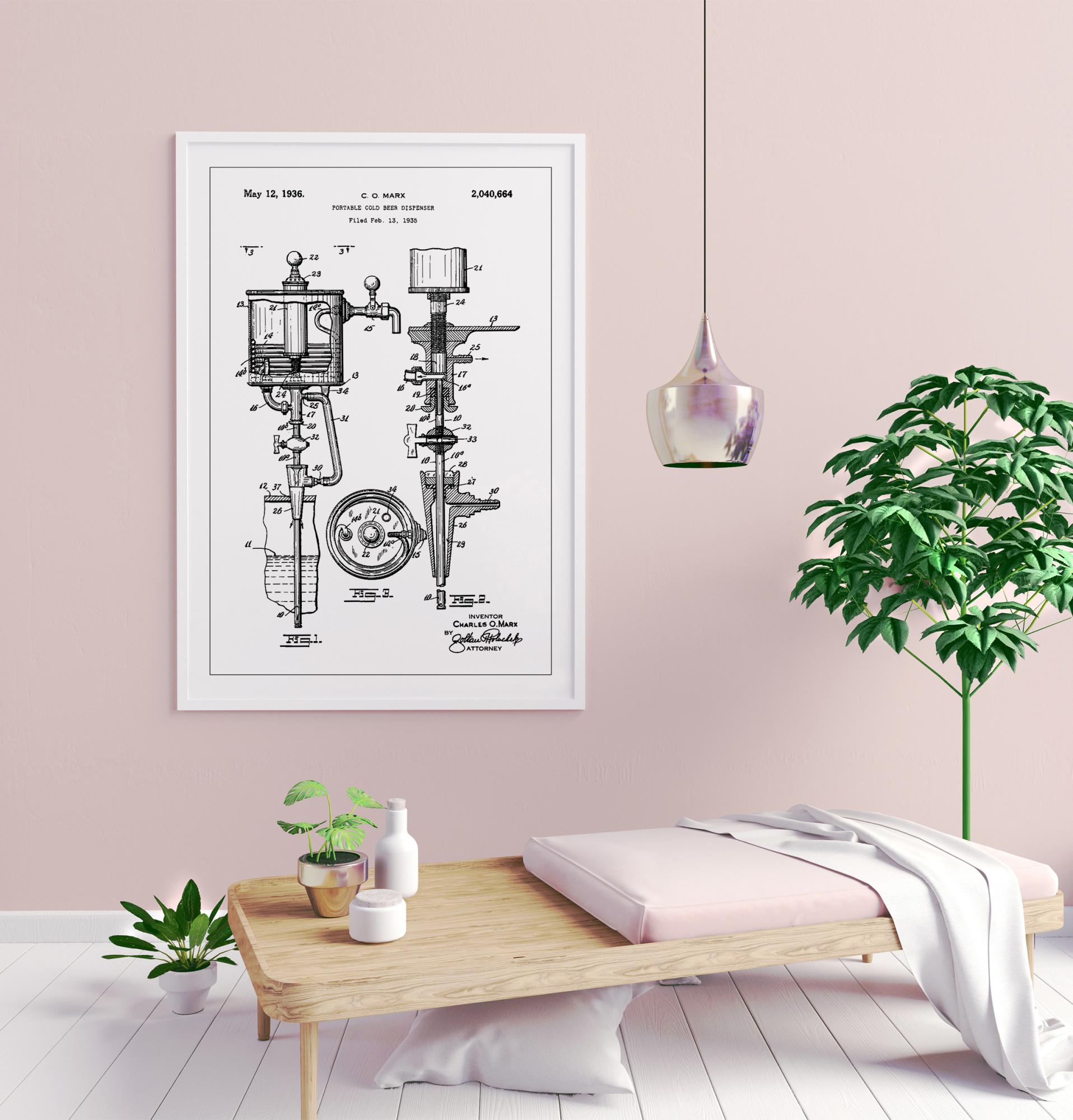 Denna konstfulla patentposter avbildar den ingående designen av en portabel kall ölutkastare, som patenterades av Charles O. Marx den 12 maj 1936. Patentnumret 2,040,664 är stolt presenterat ovanför den noggrant skisserade apparaten, där varje linje och detalj ger liv åt en unik skapelse från den industriella eran. Den eleganta svartvita kontrasten gör denna patentritning till en tidlös inredningsdetalj som passar perfekt i alltifrån en sofistikerad lounge till en entusiasts samlingsrum.
