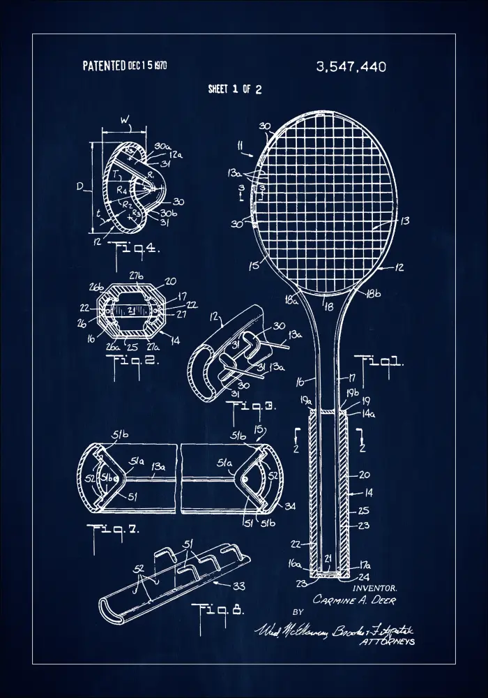 Denna patentposter återger en detaljerad svartvit teknisk ritning från det amerikanska patentet 3,547,440, utfärdat den 15 december 1970. Med dess sofistikerade och industriella estetik, visar denna patent affisch upp den komplicerade designen av en tennisracket och dess beståndsdelar, inklusive olika snitt och perspektiv som framhäver innovationen och ingenjörskonsten bakom sportens utrustning.