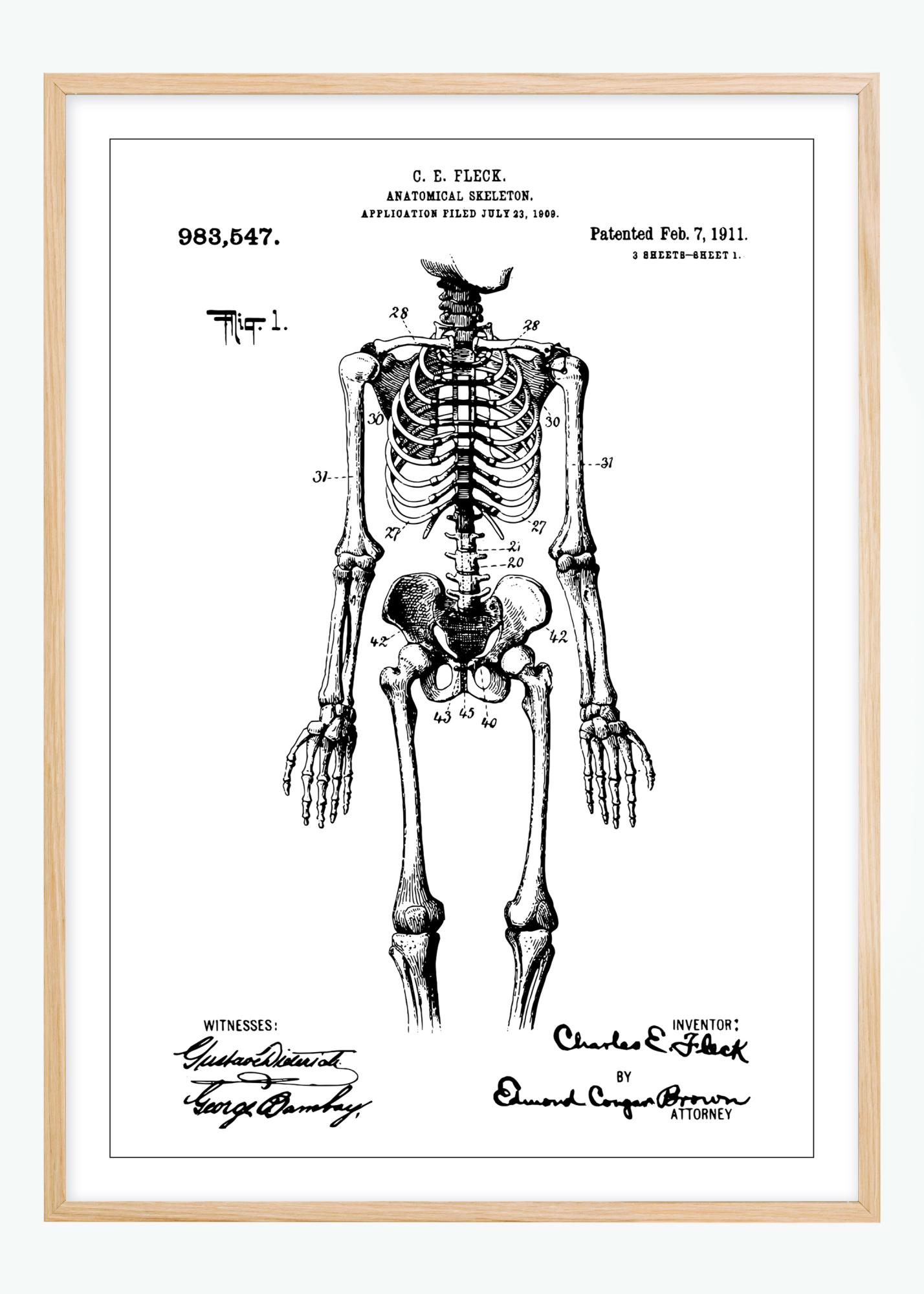 Denna pedagogiska och detaljrika patentposter presenterar en anatomisk skelettmodell, som illustreras i patentet med nummer 983,547. Patentet beviljades den 7 februari 1911 till C. E. Fleck, och är ett intressant exempel på tidig medicinsk pedagogik och design. FIG. 1 visar skelettet i full figur, vilket ger en klar översikt av kroppens struktur och benens placering.