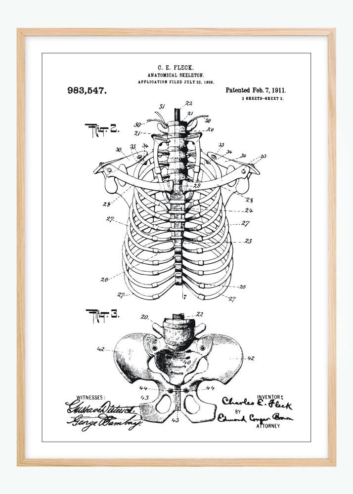 De skelett som fysiker, lärare och läkarstudenter hade att utforska var inte detaljerade nog, tyckte Charles Fleck och lämnade in dessa ritningar till patentkontoret i juli 1909. Affischen blir ett spännande och riktigt snyggt inslag på din vägg. Ritningen visar delar av ett anatomiskt skelett med välgjorda detaljer och numreringar. Högst upp ser du bland annat att patentet godkändes den 7 februari 1911 och vilket nummer det tilldelades. Längst ner finner du uppfinnarens namnteckning tillsammans med underskrifter från vittnen och en advokat. Detta är nummer 2 av 3 ritningar som hör till patentet. Givetvis finner du även nummer 1 och 3 i vårt sortiment. Postern finns i flera olika storlekar så du hittar enkelt en som passar just dig. Välj gärna till en fin ram från vårt stora utbud!