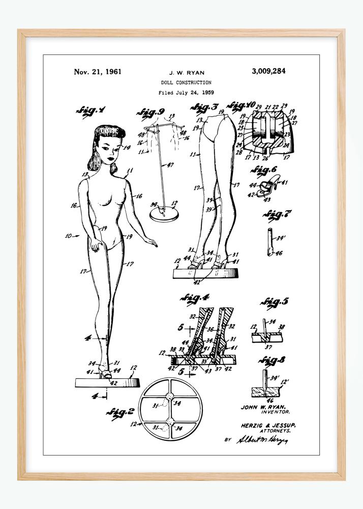 Skåda Barbie som hon såg ut i slutet av 50-talet och fascineras över hur skönhetsidealet har förändrats med tiden. Denna exklusiva affisch är en kopia av patentritningen skapad av John W. "Jack" Ryan. Högst upp kan du se att ritningen lämnades in den 25 juli 1959, att patentet utfärdades den 21 november 1961 och vilket patentnummer det fick. Längst ner finns formgivarens namn tillsammans med en underskrift från en advokat. Runt motivet löper en tunn, svart linje. Affischen är mycket detaljerad och den blir garanterat ett dekorativt inslag i ditt hem. Eftersom den finns i flera olika storlekar hittar du enkelt en såväl att ställa på en byrå som att hänga på väggen. Komplettera gärna med en snygg ram från vårt stora sortiment!