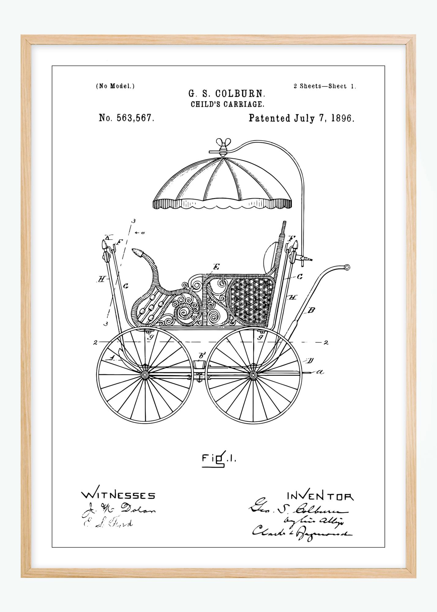 Denna charmiga patentposter avbildar en barnvagn från slutet av 1800-talet, patentnummer 563,567, beviljat den 7 juli 1896 till G.S. Colburn. Detaljrikedomen i ritningen fångar tidens konstnärskap och uppfinningsrikedom, vilket gör denna affisch till en utsökt dekorationsartikel för alla som värdesätter historiskt hantverk och design. Illustrationen visar en nostalgisk barnvagn, komplett med spetsiga hjul och en elegant sufflett, vilket återspeglar en svunnen eras elegans och stil.