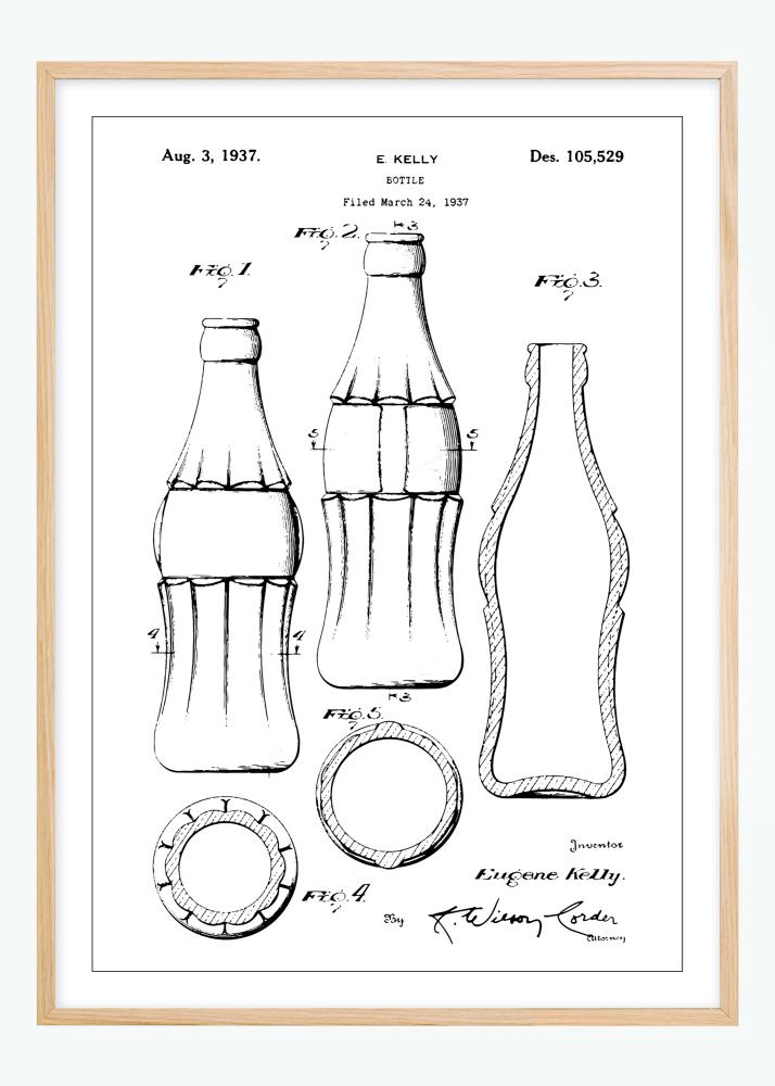 Pryd din vägg med en snygg patentritning av den berömda Coca Cola-flaskan! Denna affisch blir garanterat ett fint inslag i interiören, speciellt om du har diverse retroprylar att matcha med. Ritningen föreställer flaskan i flera olika vinklar och utföranden. Högst upp kan du se att den lämnades in den 24 mars 1937, att patentet blev godkänt den 3 augusti samma år och vilket patentnummer det tilldelades. Längst ner finns formgivaren Eugene Kellys namn samt en underskrift av en advokat. Runt motivet löper en tunn, svart linje. Eftersom planschen finns i flera olika utföranden hittar du enkelt en som passar i just ditt hem. Komplettera gärna med en ram från vårt stora sortiment!