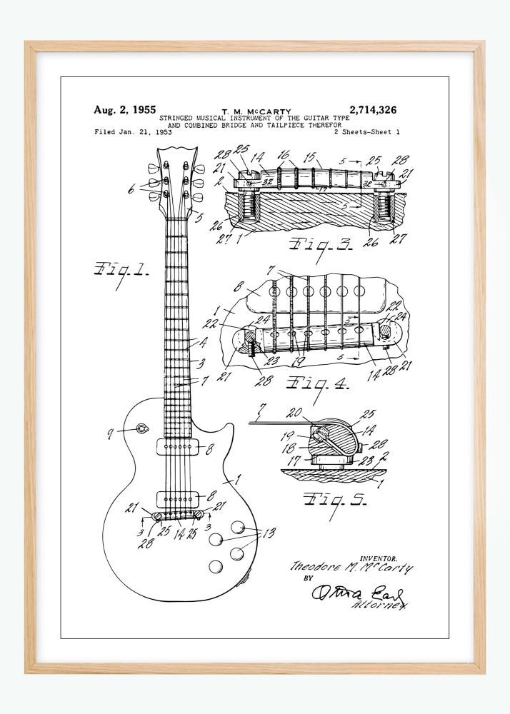 Denna patentposter visar en detaljerad ritning av en strängmusikinstrument, specifikt en gitarr, vilket dokumenterades av uppfinnaren Theodore M. McCarty den 2 augusti 1955 under patentnummer 2,714,326. Ritningen skildrar instrumentets konstruktion med en kombinerad bro och svansstycke, en nydanande design som bidrog till gitarrens ton och spelbarhet. De olika vyerna ger en insyn i de mekaniska och estetiska aspekterna av gitarrens design.