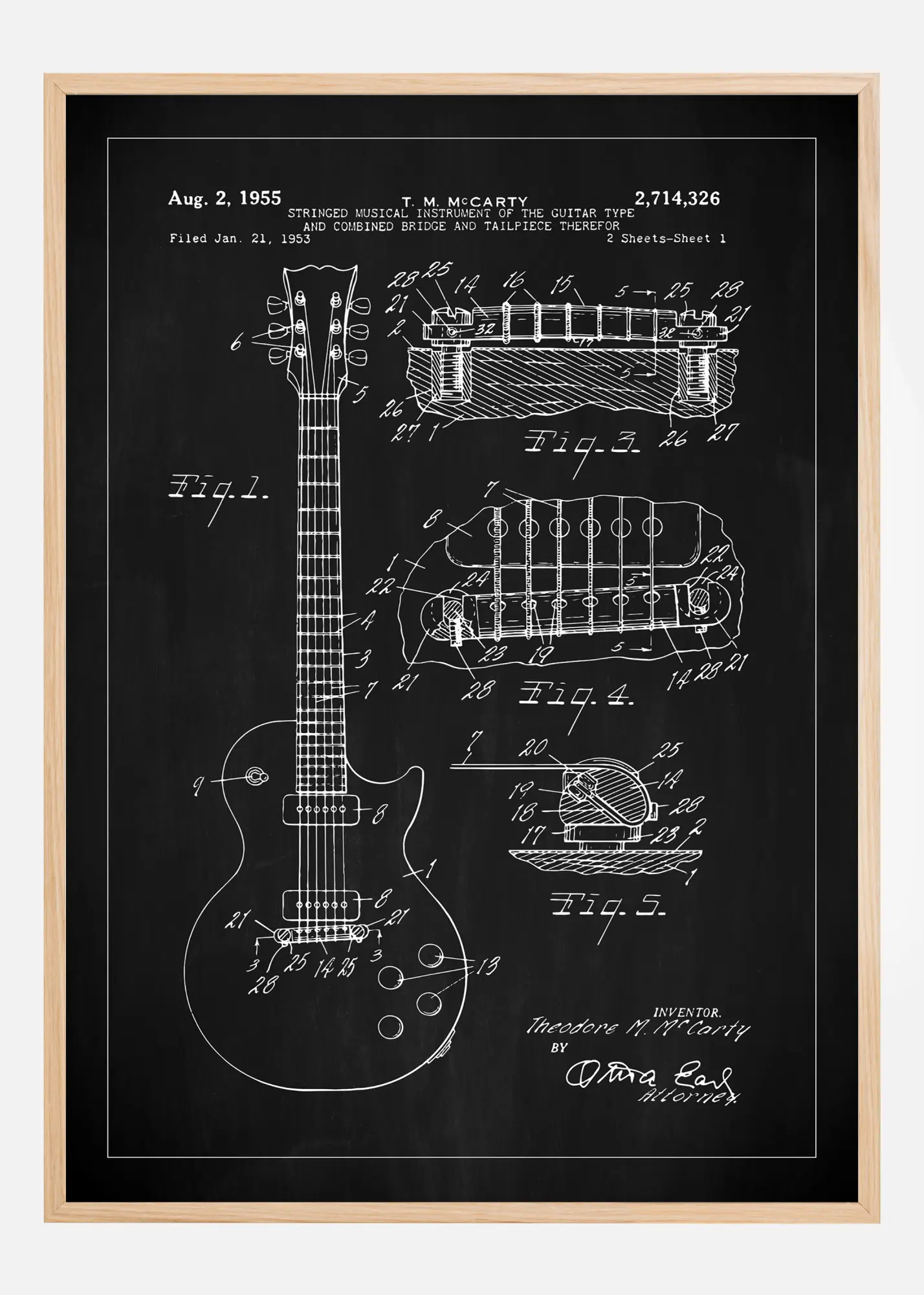 Denna patentposter avbildar en klassisk strängmusikinstrumentdesign, särskilt en elgitarr, med datumet Augusti 2, 1955, och patentnummer 2,714,326. Patentet lämnades in den 21 januari 1953 av Theodore M. McCarty, och den presenterar gitarrdesignens eleganta form och uppfinningsrika mekanik. Illustrationen, med dess detaljerade vy över instrumentets front, sektionssnitt och komponentdetaljer, visar den tidlösa skönheten och hantverket bakom detta musikinstrument.