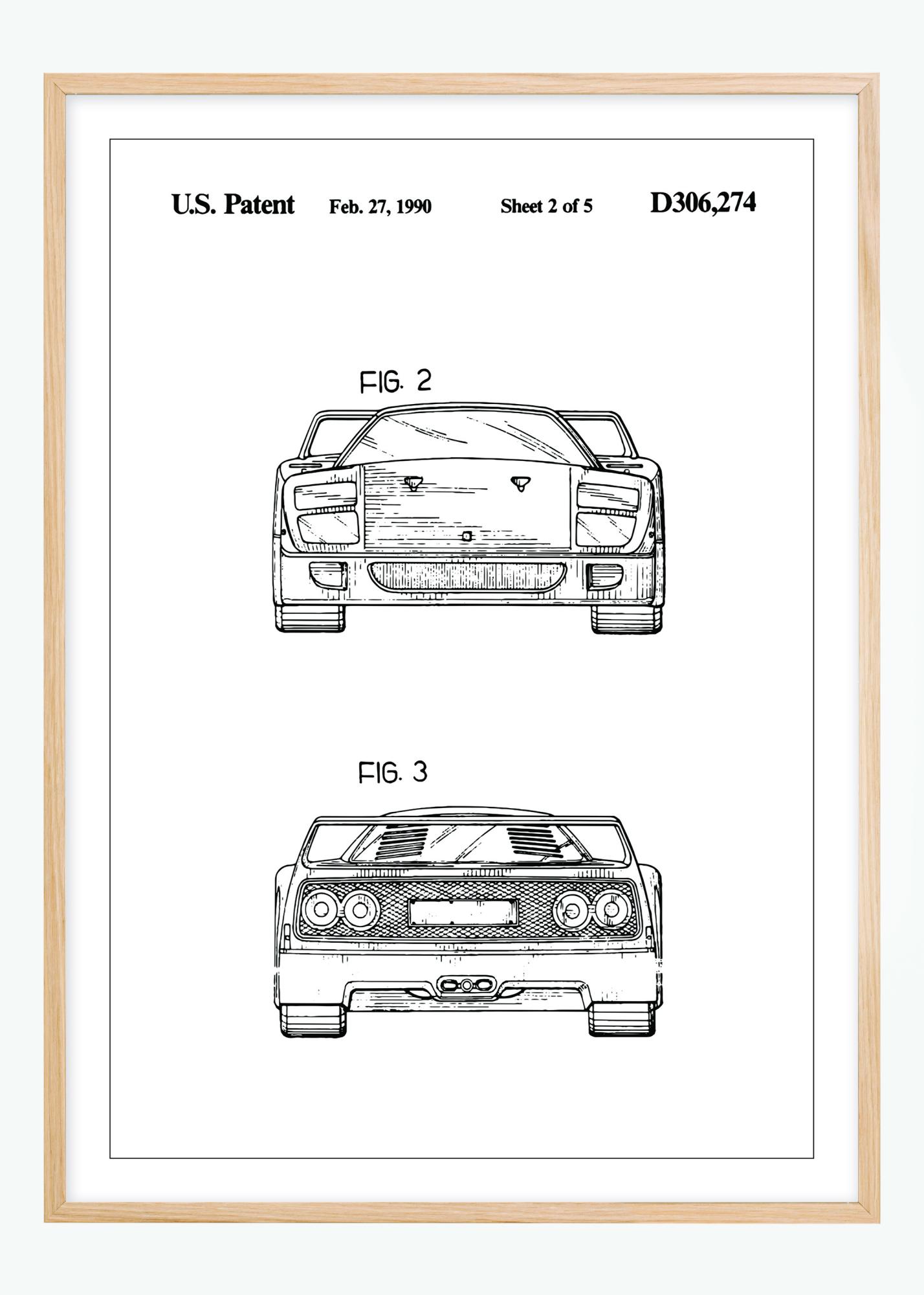 Denna patentposter avbildar den bakre designen av en Ferarri F40, som beviljades patent den 27 februari 1990 under nummer D306,274. Ritningarna visar bilens fram och baksida med dess distinkta ljusarrangemang, stötfångare, och formgivning. Detaljerna i illustrationerna belyser de unika designelement som särskiljer denna bilmodell och bidrar till dess igenkänning på vägarna.