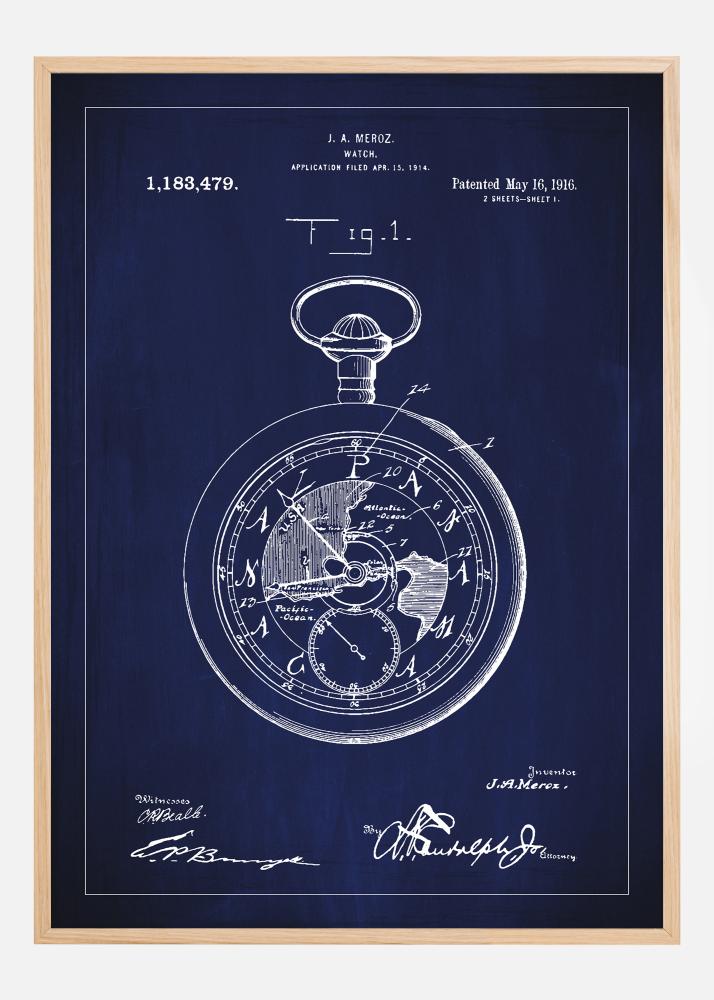 Utforska historiens uppfinningsrikedom med vår exklusiva patentposter som skildrar en klassisk tidmätare. Denna autentiska patentritning, ursprungligen inlämnad den 15 april 1914 och beviljad patentnummer 1,183,479 den 16 maj 1916, framhäver den tidlösa innovationen av J.A. Meroz. Dess noggranna detaljer och tekniska skisser ger en unik inblick i armbandsurets tidiga utveckling. Denna patent affisch kombinerar industrihistoria med elegant design och blir en perfekt konversationsstartare för alla som uppskattar mekanisk design och historiska dokument.